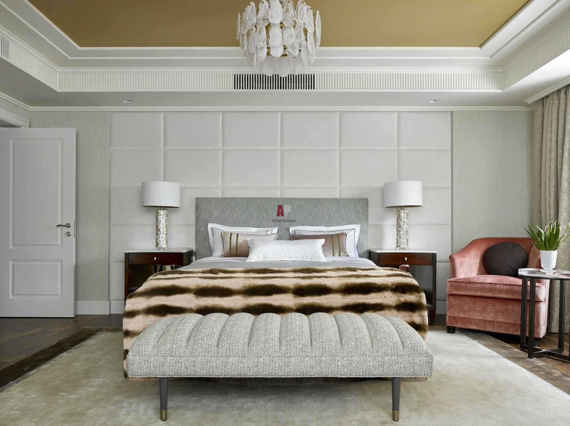 Квартира в американском стиле для молодоженов. Обои, Omexco. Кровать в обивке тканью Designers Guild, на заказ. Прикроватные тумбы, Caracole. Кресло, Century Furniture. Люстра и банкетка, Arteriors.