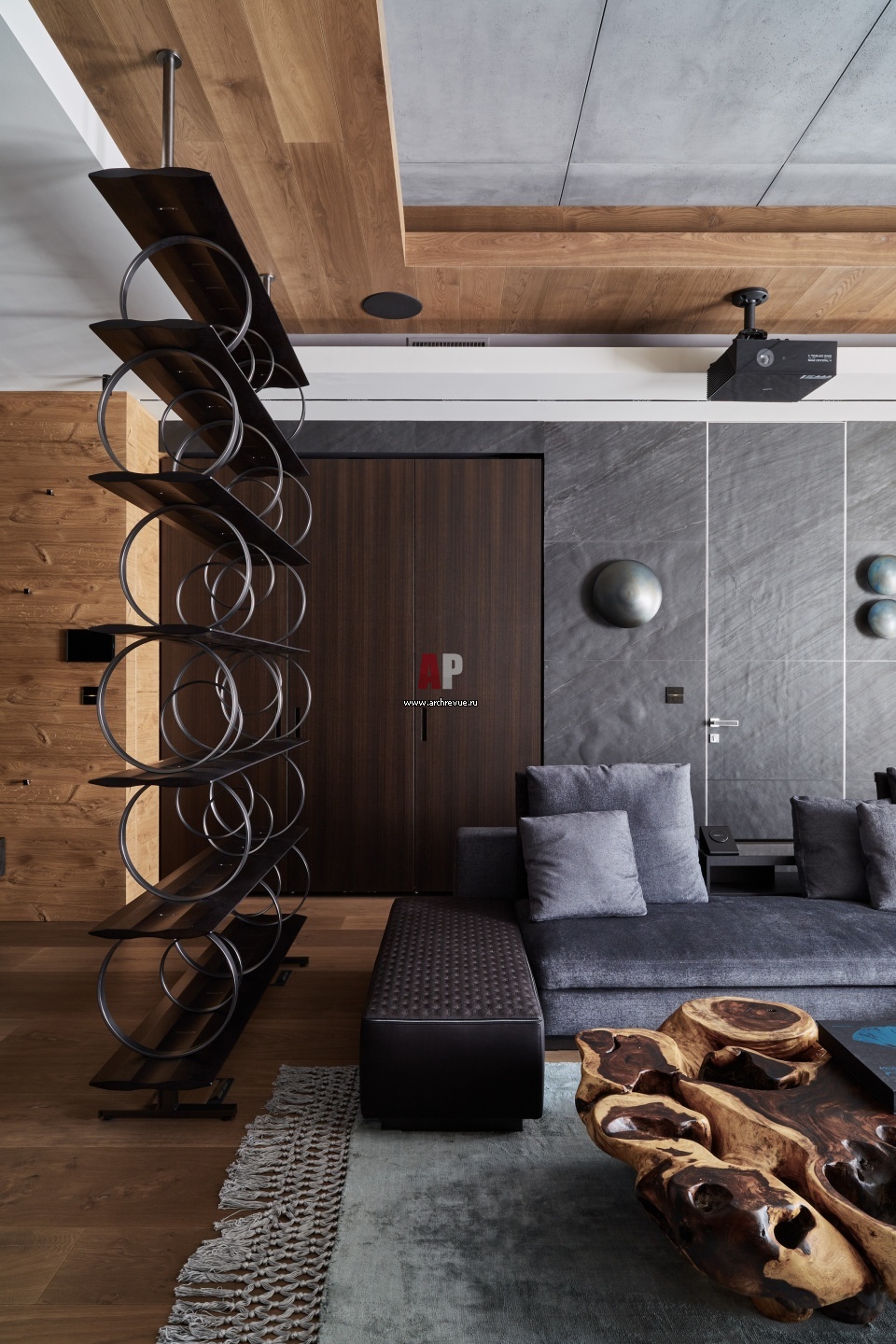 Современный экологичный интерьер в Хамовниках. Гостиная. На полу – дубовый паркет, обработанный натуральными кислотами, доски разного формата: ширина 24-40 см, дина – 150-300 см. Панелирование стен, отделка дверного полотна шпоном камня.