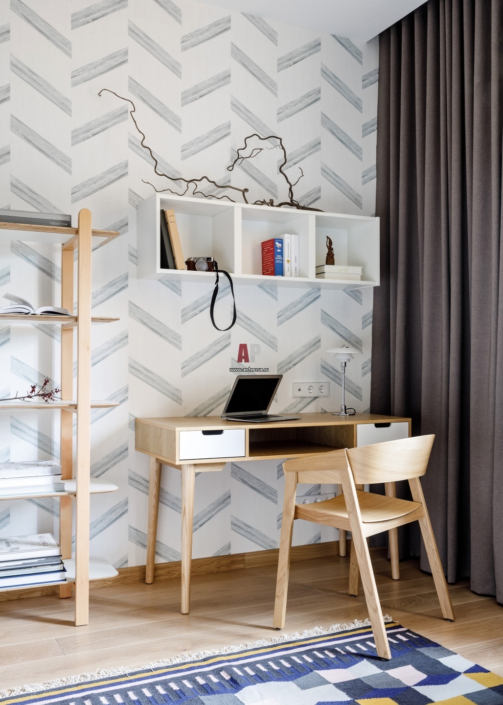 Кабинет. Рабочий стол и стеллаж выполнены из светлого натурального дуба. Стул, Muuto. Рисунок обоев напоминает березовую кору.