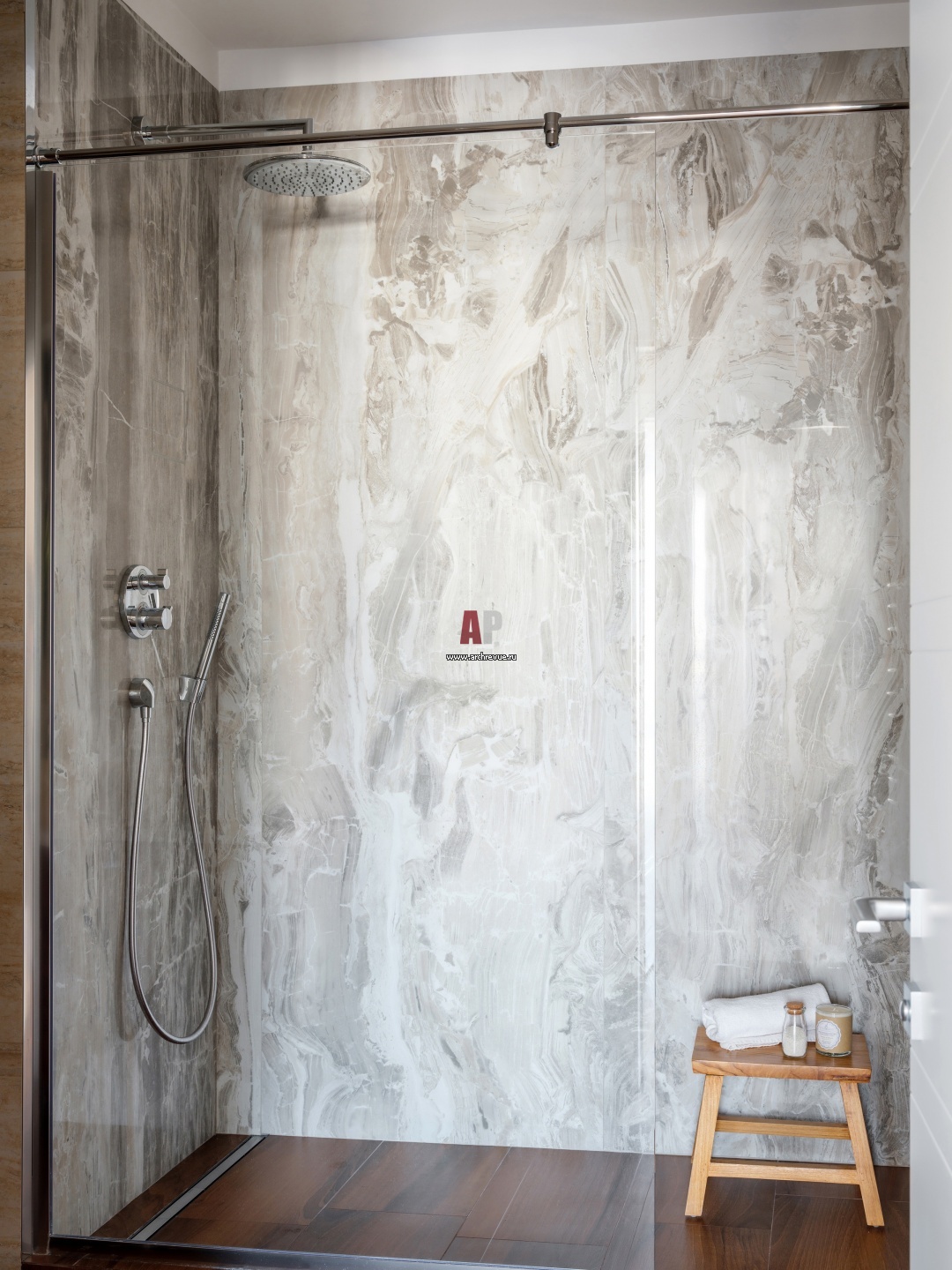 Ванная комната. Зона душевой выделена лаконичным серым камнем. На полу – палубная доска из тика.