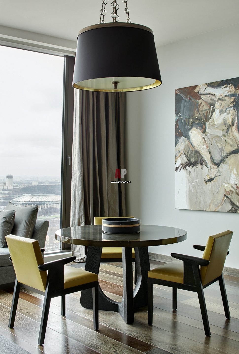 Столовая группа в общей гостиной. Обеденный стол, стулья Christian Liaigre, модели Montefauson и Hector. Люстра, Wired Custom Lighting.