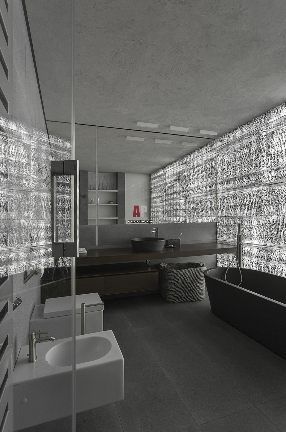 Интерьер ванной комнаты решен в минимализме. Стены помещения оформлены светобетоном LiTraCon с диодной подсветкой. Благодаря особой структуре этого материала, которая способна пропускать лишь часть света, можно создать интересные визуальные эффекты.