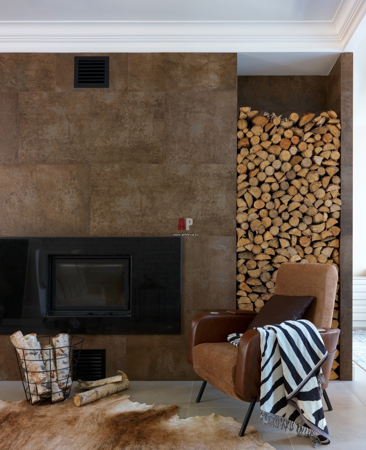 Развивая тему лофта и брутальности, дизайнер оформила стену, на которой располагается камин, ржавым железом, как будто это паровозная печь. В процессе детальной проработки пришли к мнению, что технологически лучше сделать это из крупноформатного керамогранита с эффектом ржавчины.