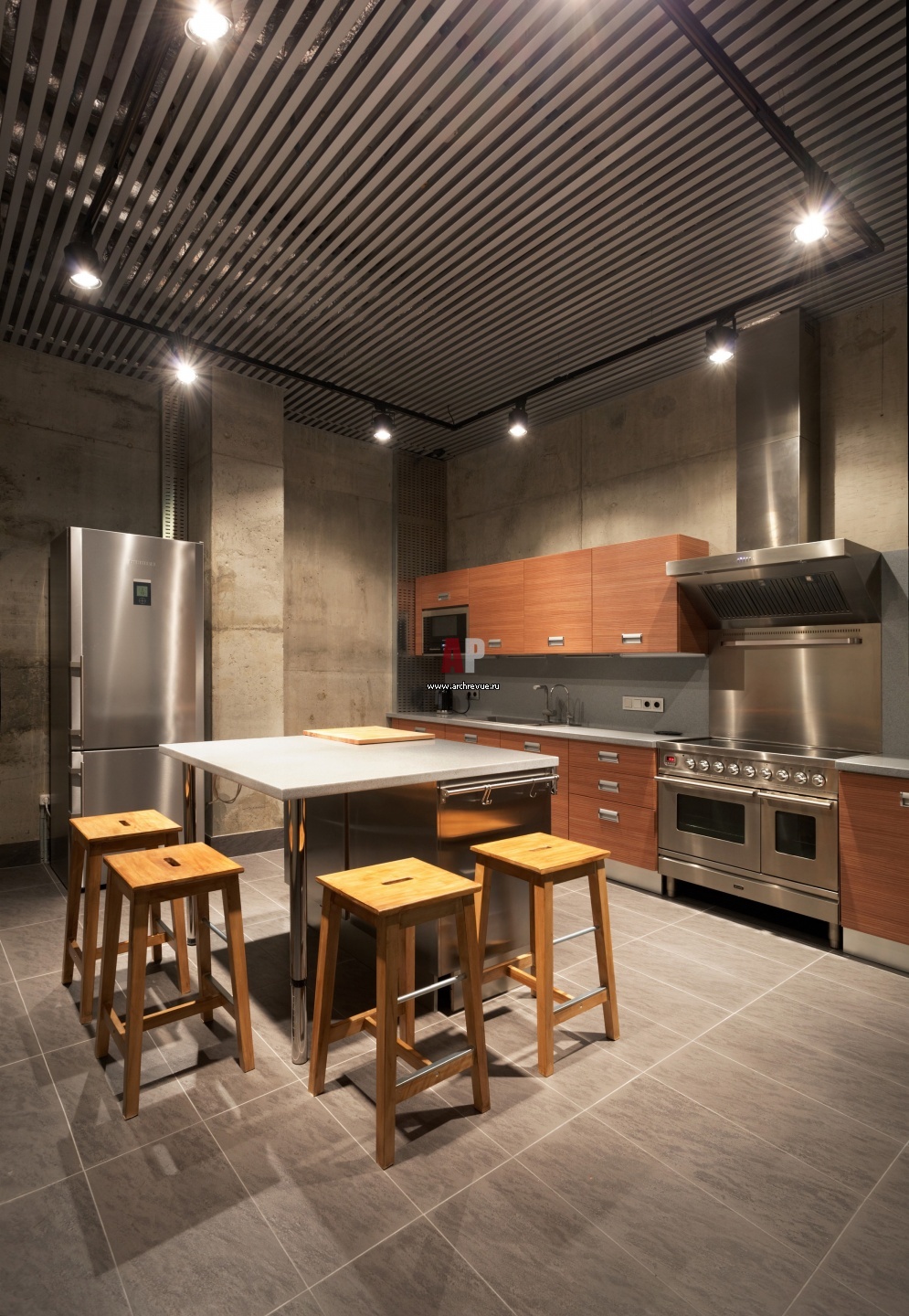 Интерьер кухни выдержан в стиле техно с обилием камня и металла.