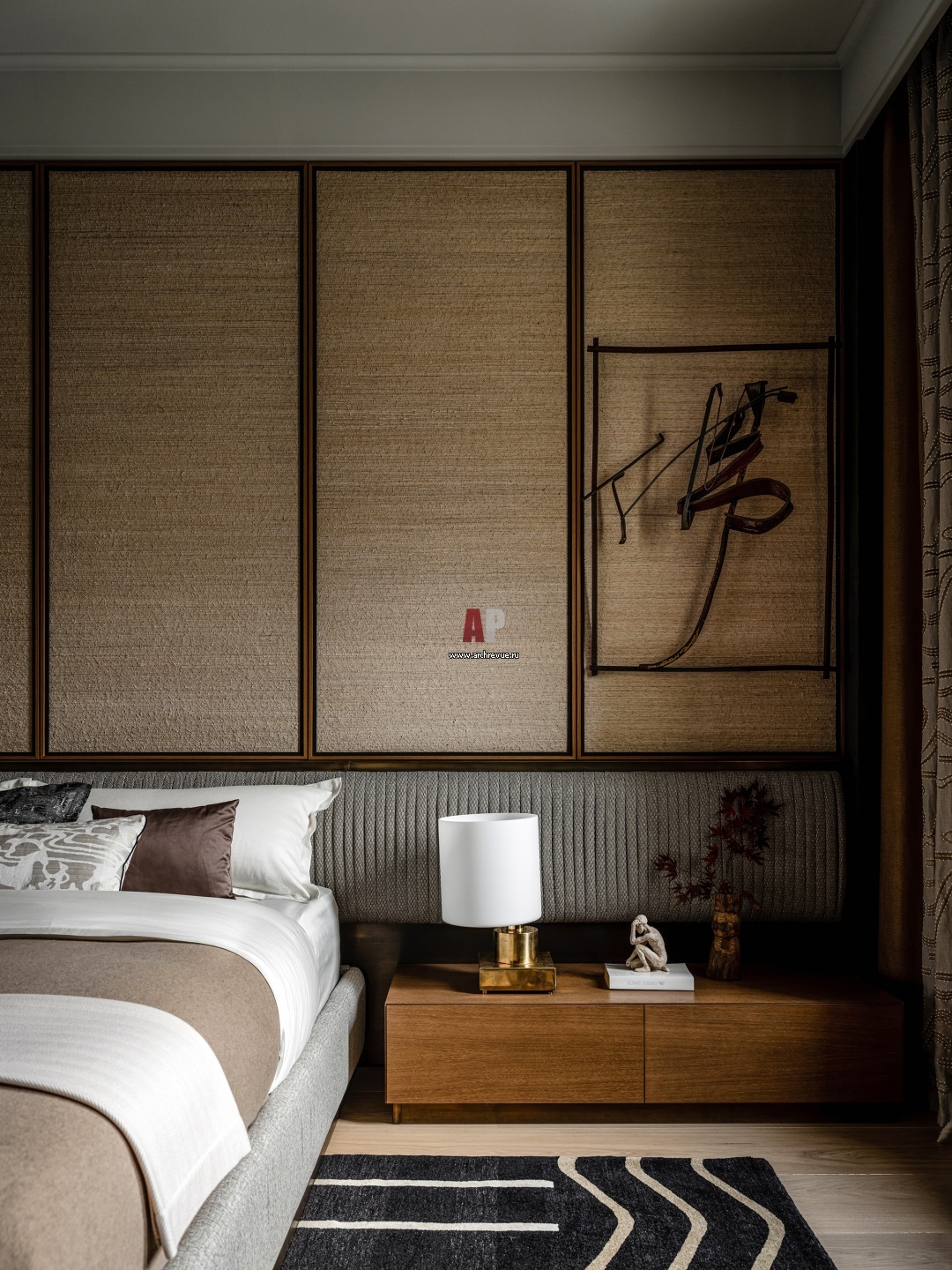 Хозяйская спальня. Изголовье, кровать и прикроватные столики выполнены на заказ по эскизам дизайнера. Лампа, винтаж, Франция. Металлическое панно Дмитрия Гутова.