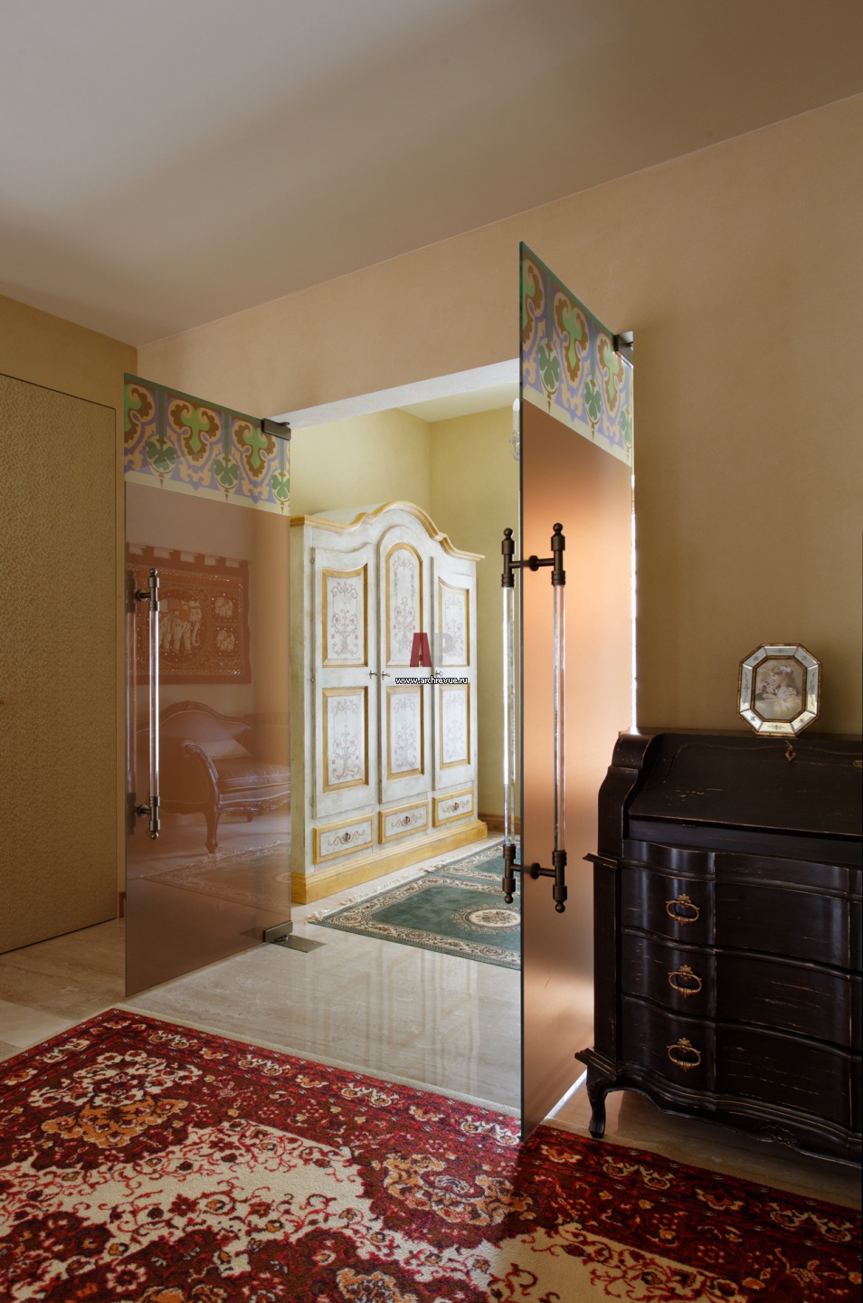 Верх стеклянных дверей украшен декоративным кантом с кельтским орнаментом. На стекло рисунок нанесен метолом полимеризации.