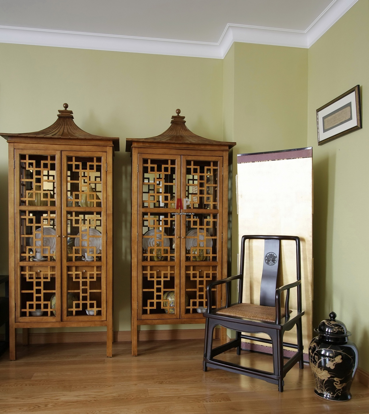 Фото интерьера гостиной. Китайские комоды с резными фасадами, которые работают на просвет.