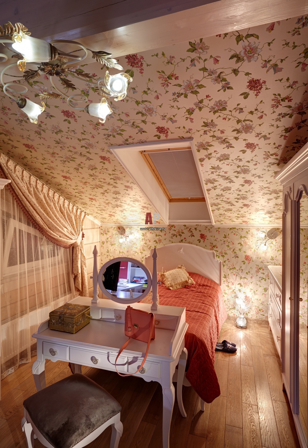 Фото интерьера детской девочки в мансарде. Мансардные окна, VELUX. Стены и потолок оклеены бумажными обоями с цветочным рисунком, поставщик «Ампир Декор».
