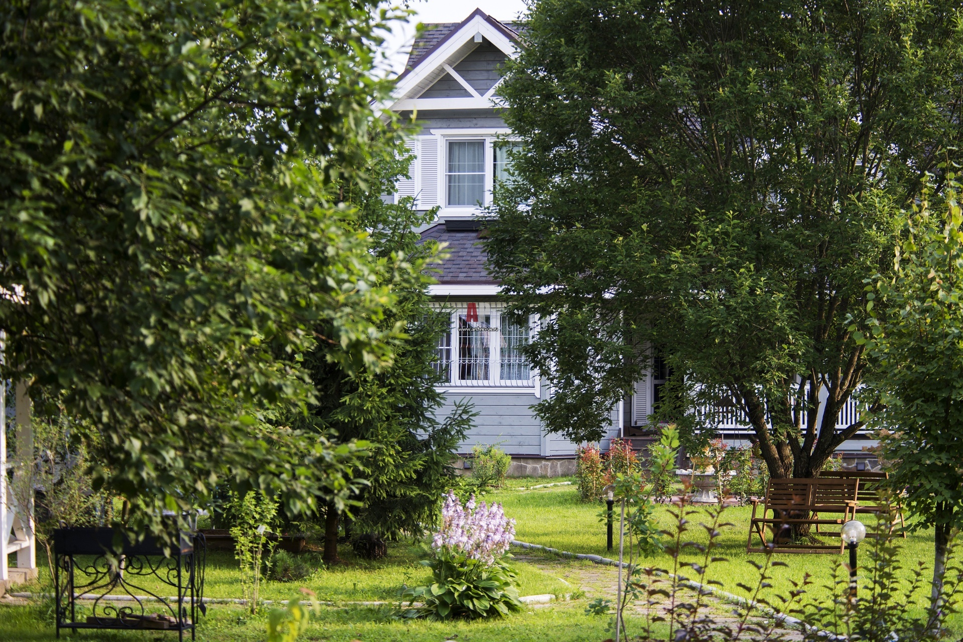Двухэтажный дом возведен по финской технологии каркасного строительства. Он прекрасно вписывается в застройку старого дачного места и благодаря серо-белой гамме выгодно контрастирует с зеленой листвой сада.