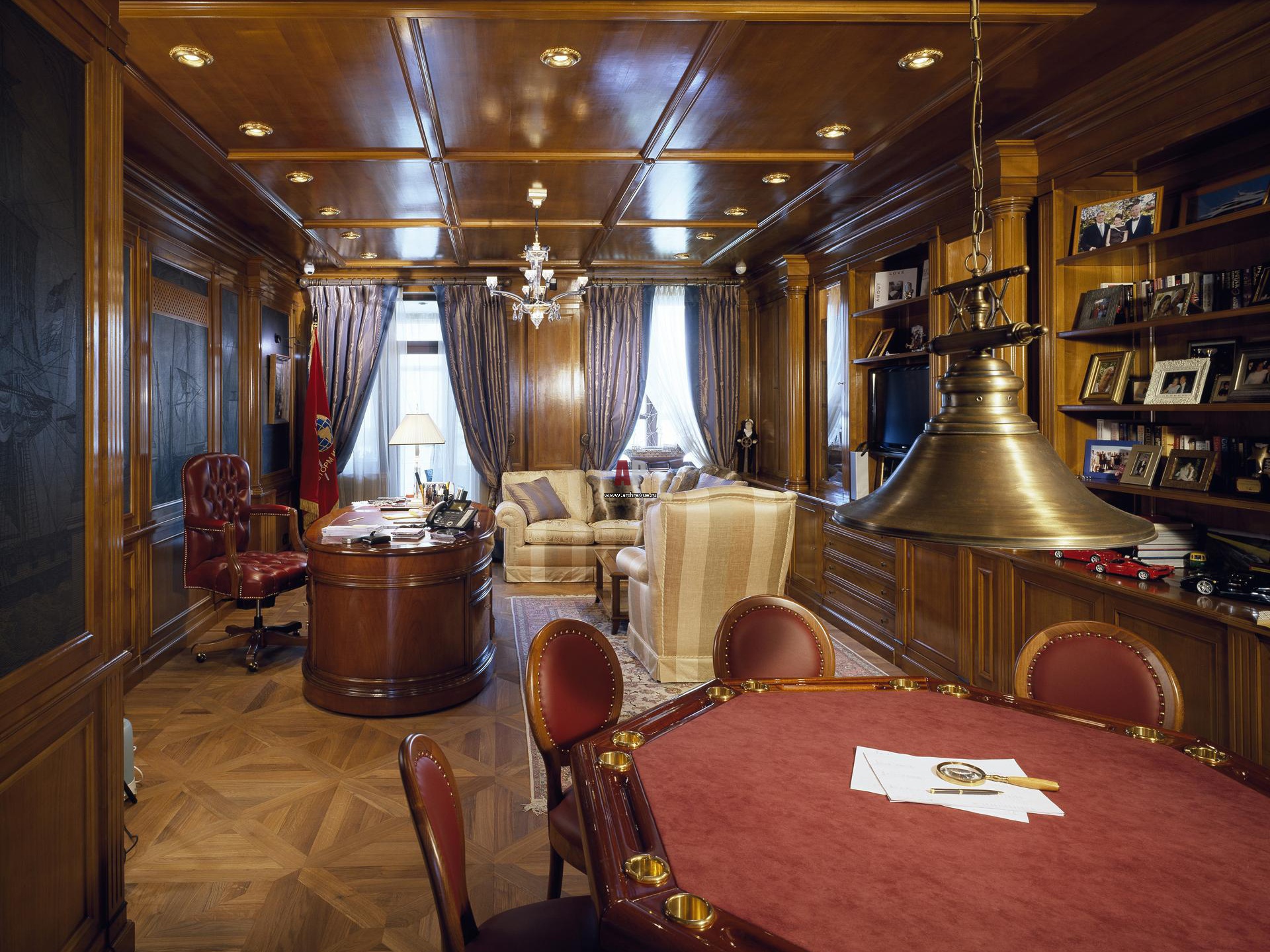 Кабинет хозяина – часть приватного пространства квартиры. Он условно разделен на две части: зону письменного и игрального столов. Кабинет оформлен с помощью дерева, на стенах декоративные настенные панно с изображениями яхт. Панно выполнены в той же технике, что и в бильярдной зоне. Изображения старых гравюр были переведены в модуль и напечатаны в мастерской шелкографии «Московская студия мастерская шелкографии Б. Бельского»
