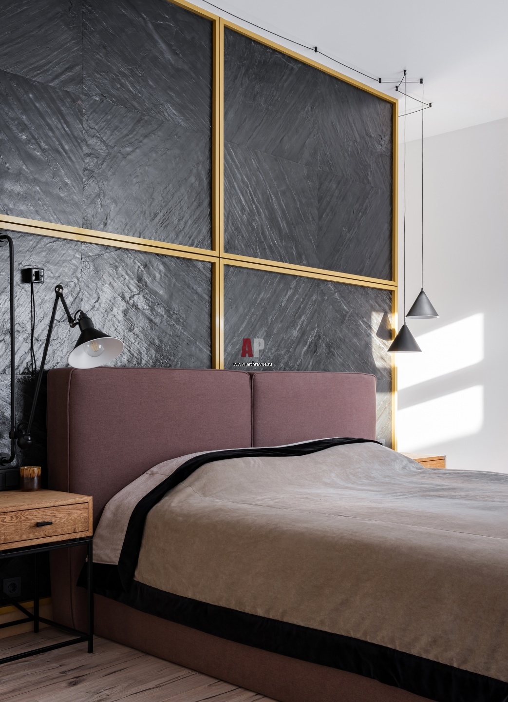 Сена за изголовьем кровати в хозяйской спальне заполнена листами из каменного шпона в металлическом обрамлении. За ней находится гардеробная. Над тумбами – подвесные светильники с открытой проводкой.