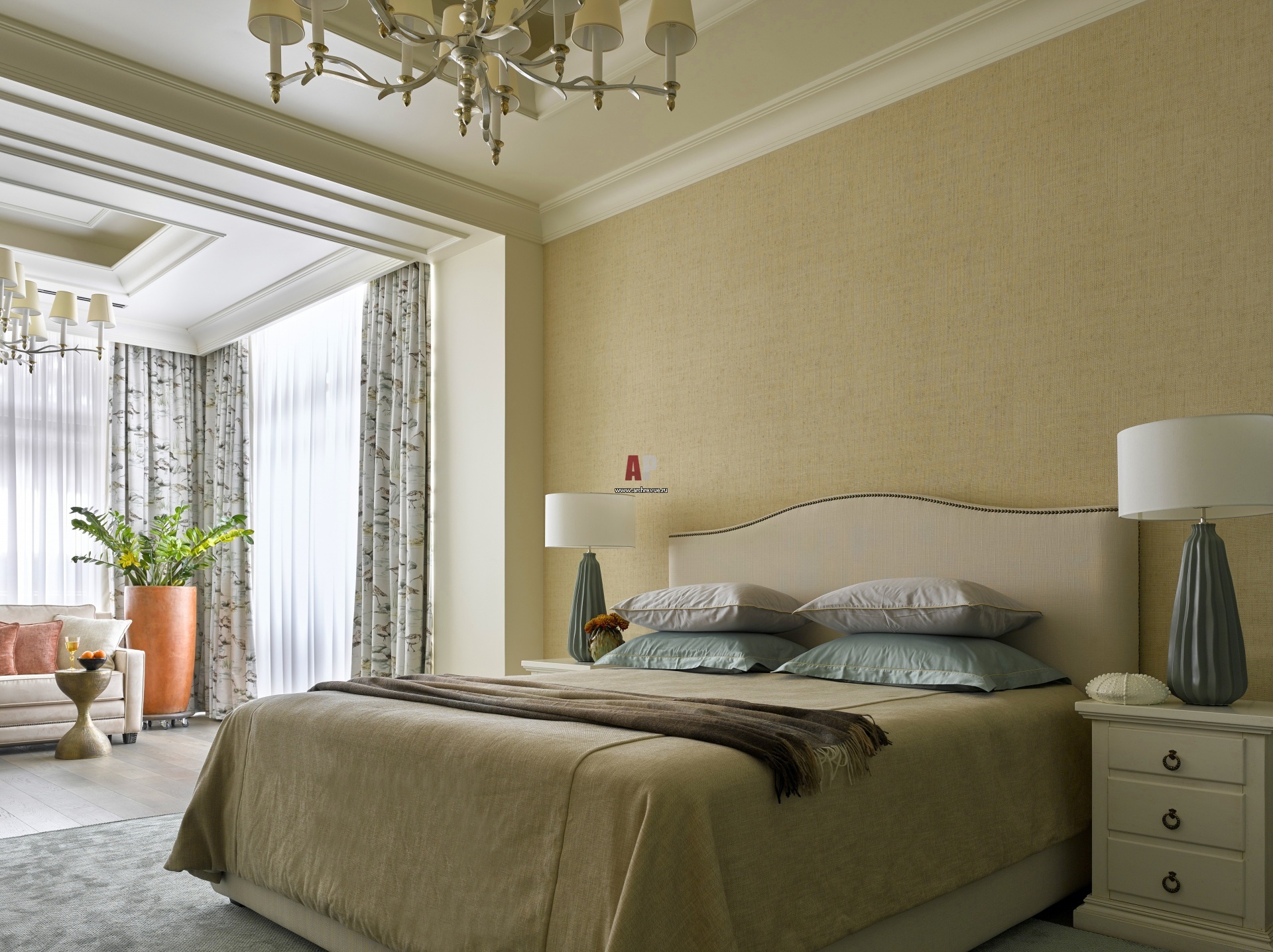 Детская выполнена в теплой палитре. На стенах – текстильные обои с тактильной фактурой. Кровать, Dantone Home.