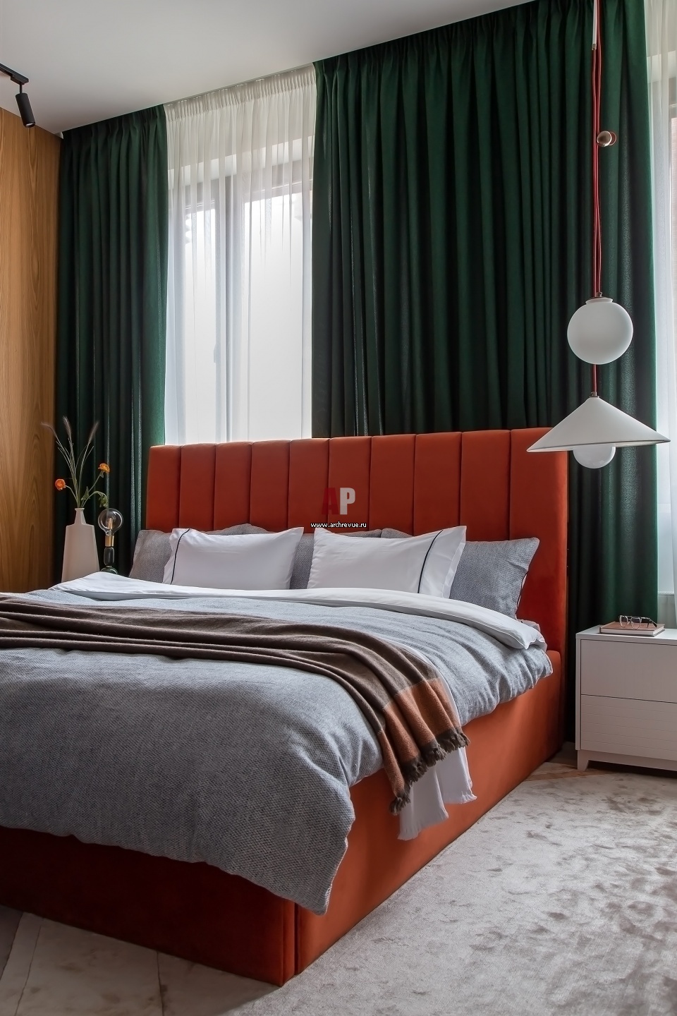 Кровать в хозяйской спальне поставлена изголовьем к окну, чтобы дать возможность хозяевам максимально расслабиться. Она выполнена на заказ и обита оранжевым текстилем, шторы сшиты из изумрудно-зеленого бархата.