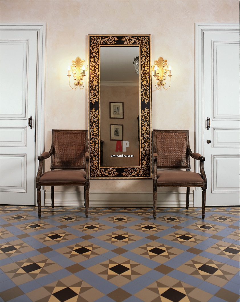 Интерьер холла в восточном стиле. Полы выстланы метлахской плиткой Winckelmans сине-коричневых оттенков, поставщик «Грета Вульф».