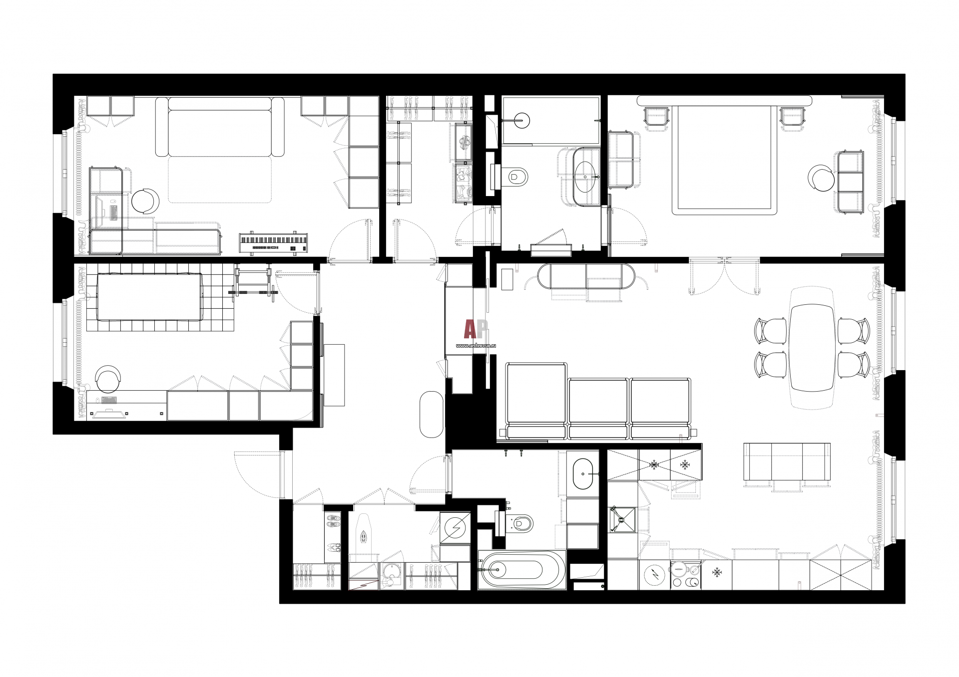 План семейной квартиры с 3-мя спальнями. Общая площадь – 135 кв. м.