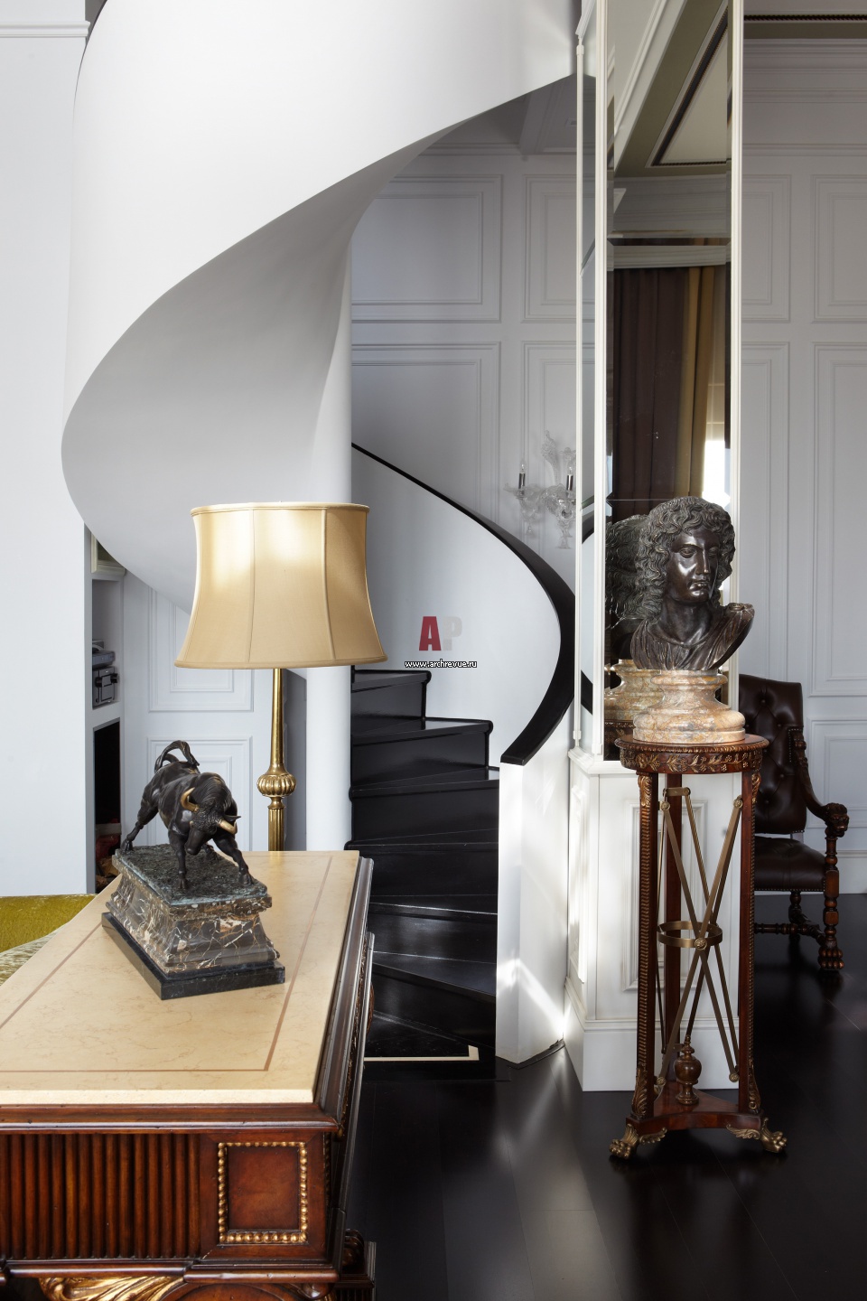 Витая конструктивистская лестница ведет к приватным помещениям. Монолитная конструкция отделана штукатуркой, пластичные перила – деревянные, ступени облицованы тёмным деревом.