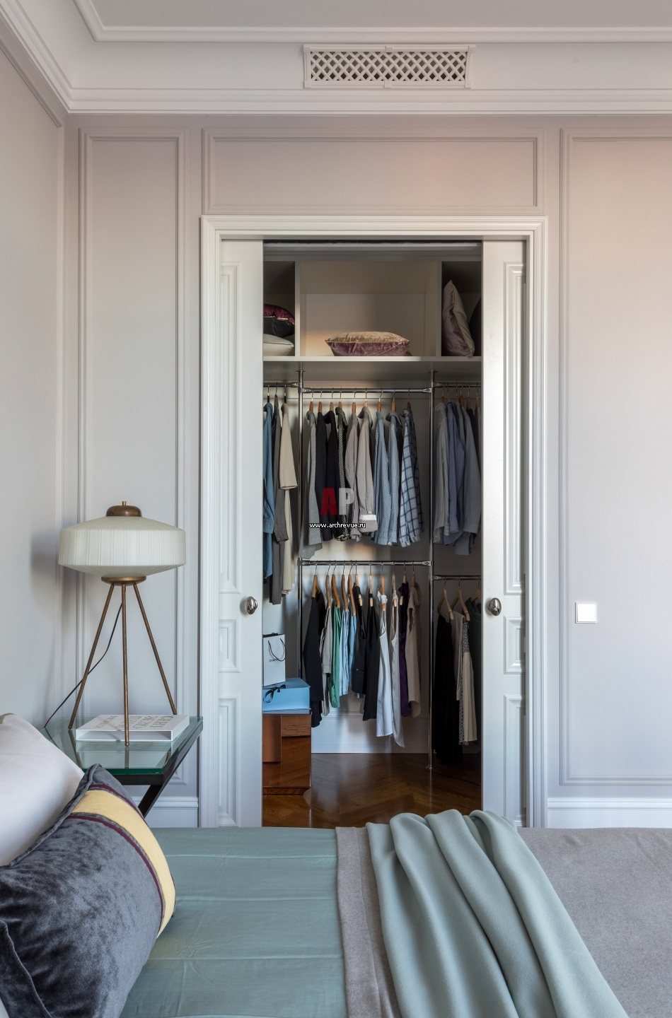 Хозяйская спальня. Гардеробная встроена в нишу, белые раздвижные двери растворяются в пространстве и не привлекают к себе внимание.