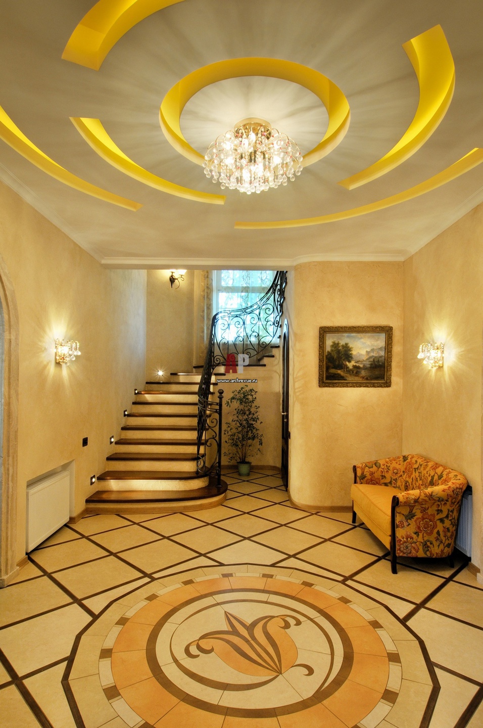 Оформляя зону холла, автор развивает растительную тему, используя ее в декоре пола – цветок из керамогранита, нарезанного по эскизам дизайнеров. И в рисунке кованого ограждения лестницы. Ковка, компания «ОГО »