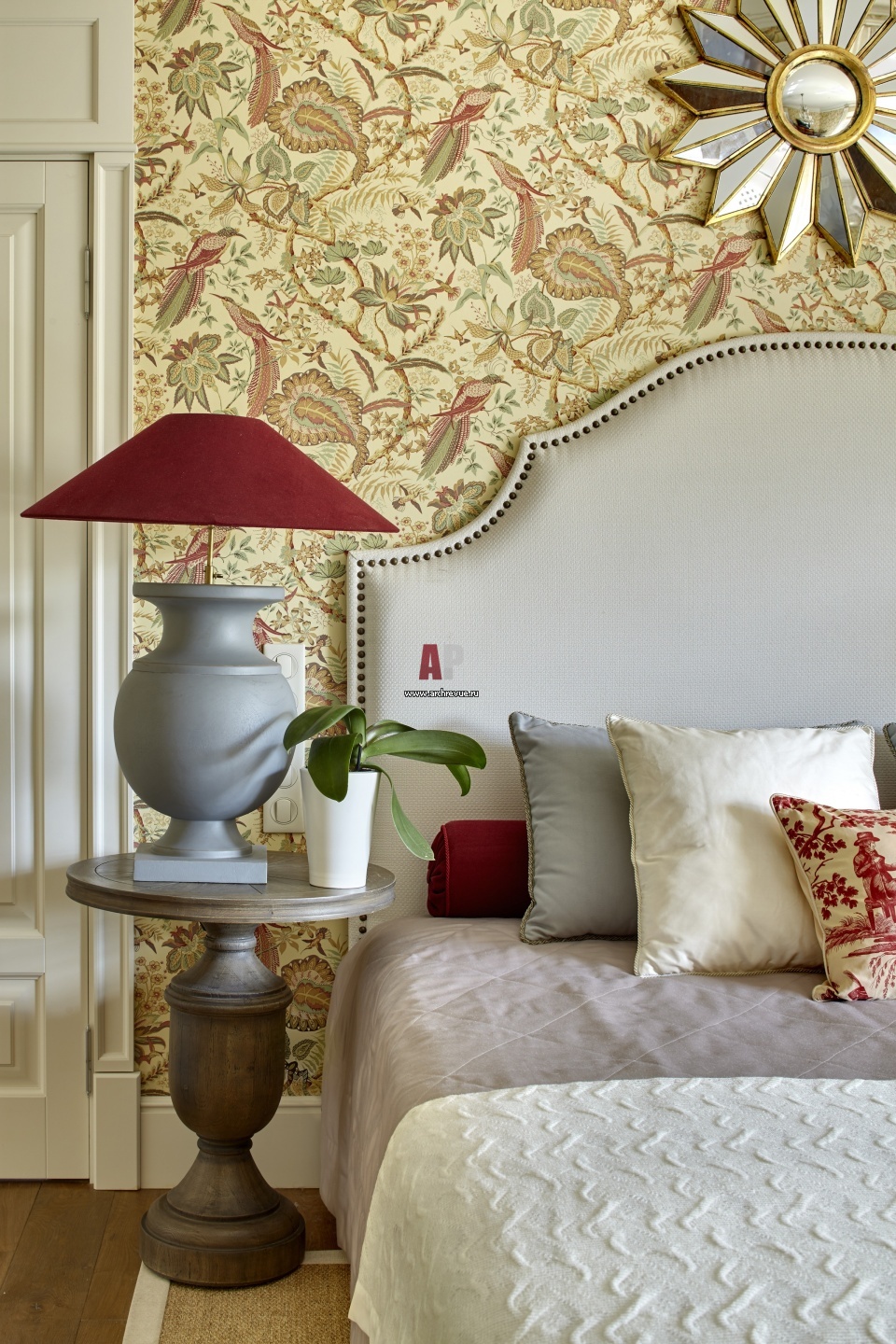 Интерьер спальни. Абажуры для настольных ламп сделаны на заказ.