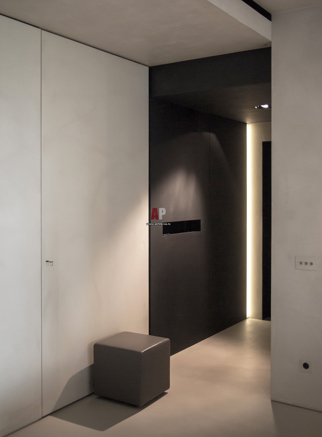 Интерьер прихожей в квартире. Входная группа обозначена декоративным порталом черного цвета. С ним рифмуется черный пуф.