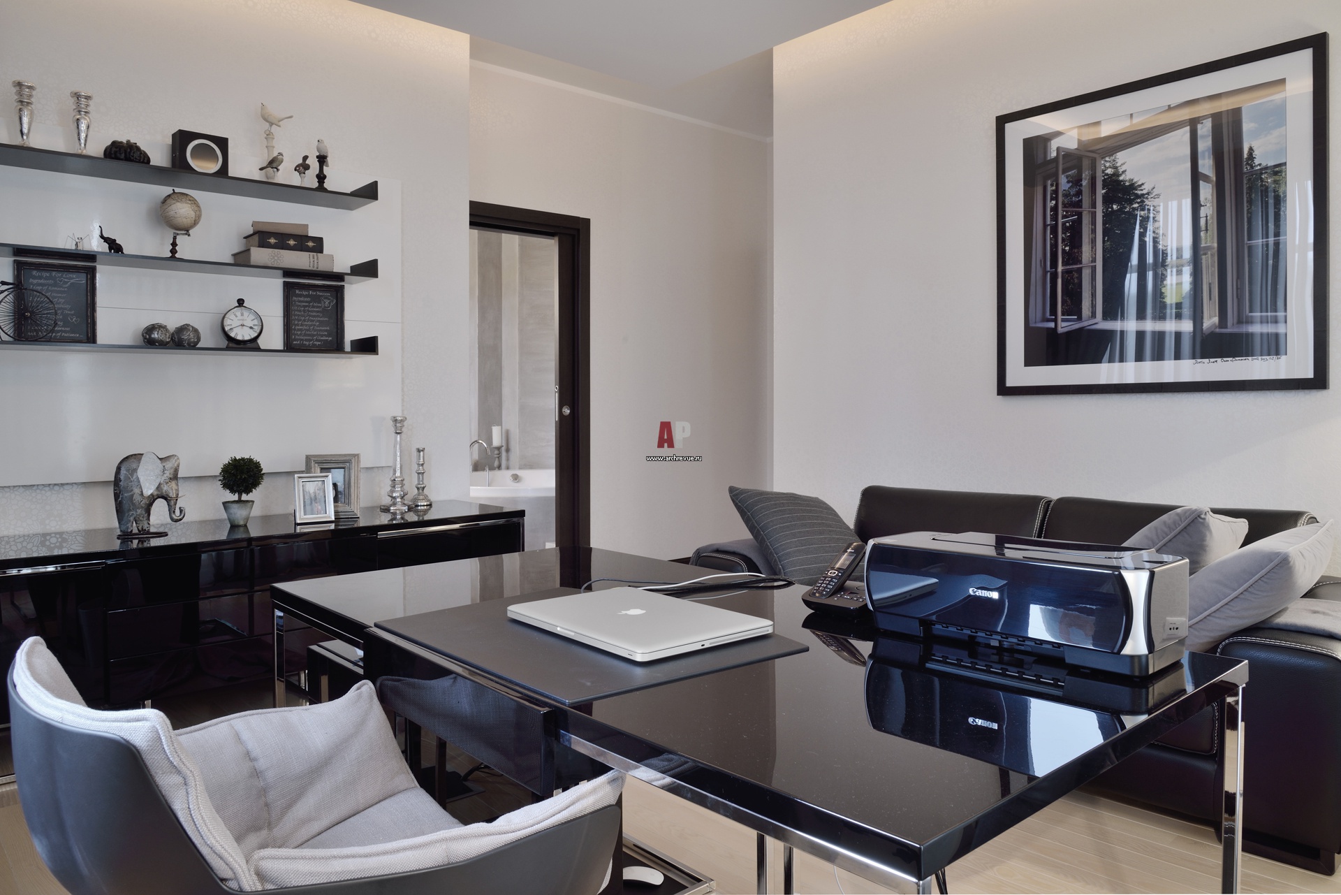 Фото интерьера кабинета. Комод и полки из черного лакированного дерева. Рабочий стол из металла столешница из черного полированного камня. Напротив стола – кожаный диван.