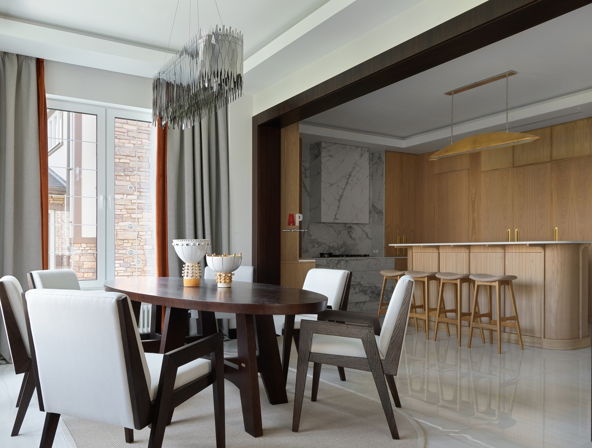 Яркий дом для семьи с детьми в поселке «Новые Вешки». Интерьер кухни-столовой. Над кухней с островом трудились три компании-подрядчика: одна изготавливала конструктив, другая – фасады, третья занималась работами по камню.