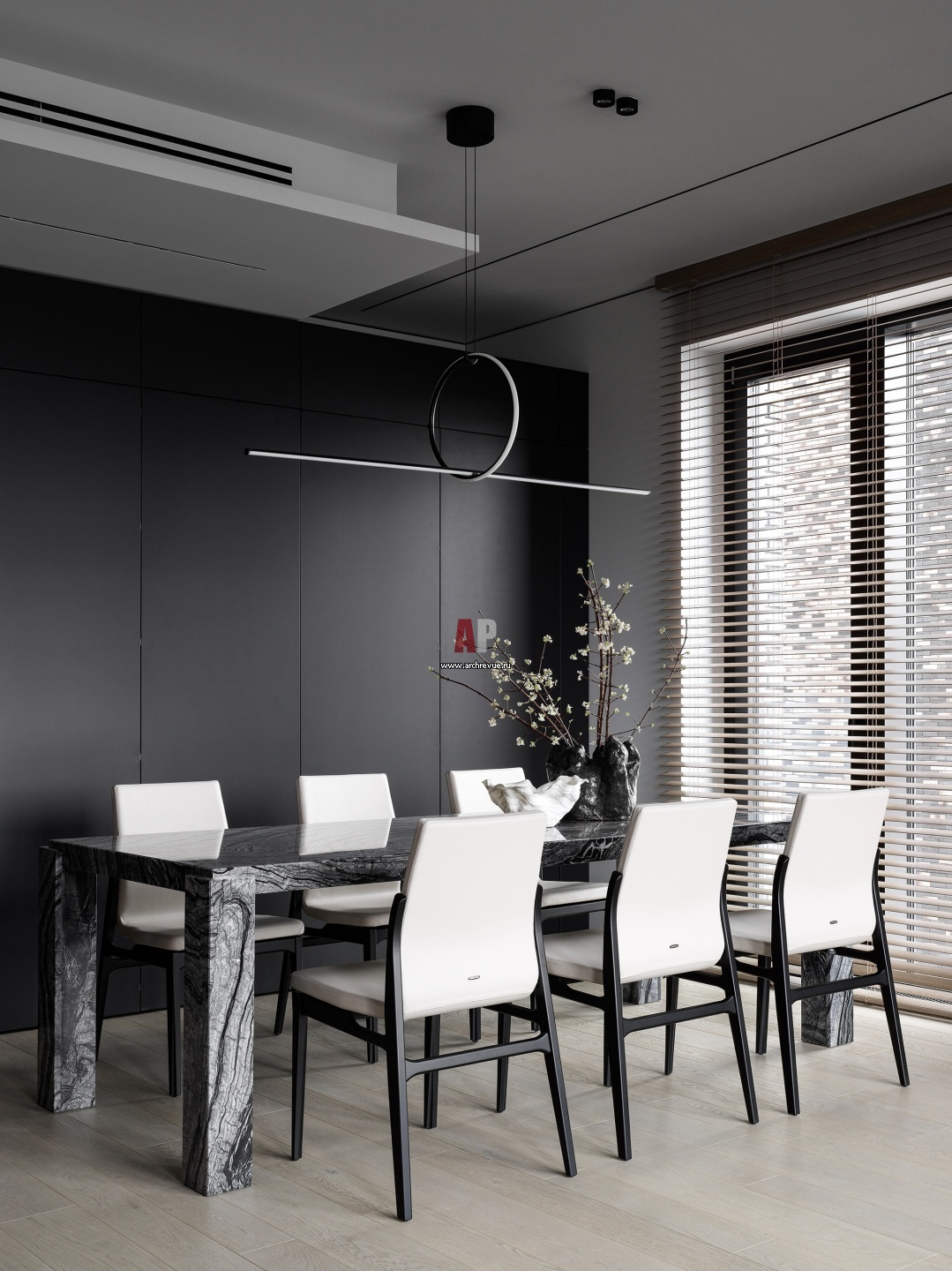 При закрытых кухонных фасадах на первый план выходит столовая группа с обеденным столом из камня Silver Wave.