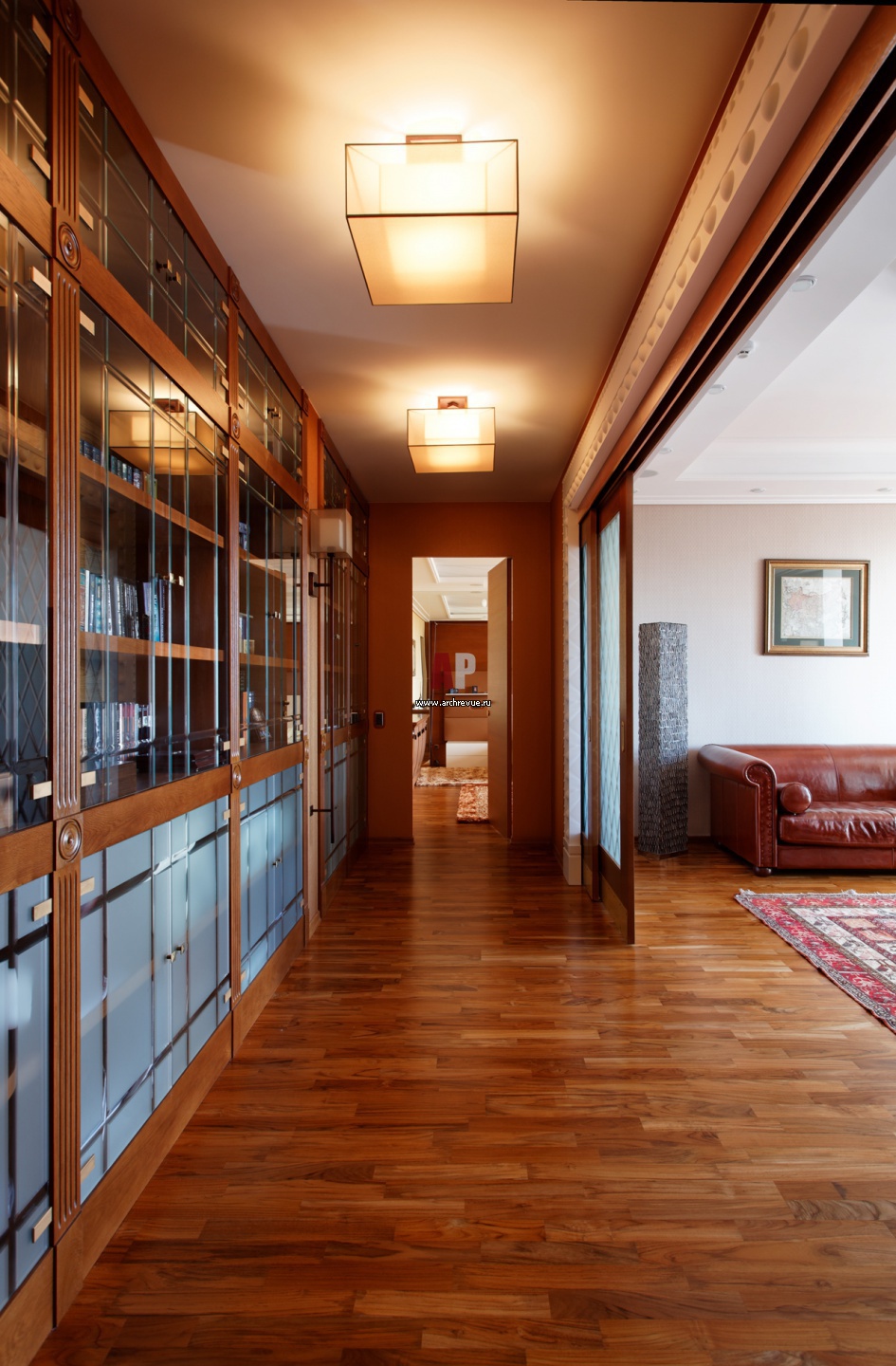 Библиотечные шкафы с книгами выстроены вдоль одной из стен в коридоре. Такой прием – пример грамотного использования пространства.