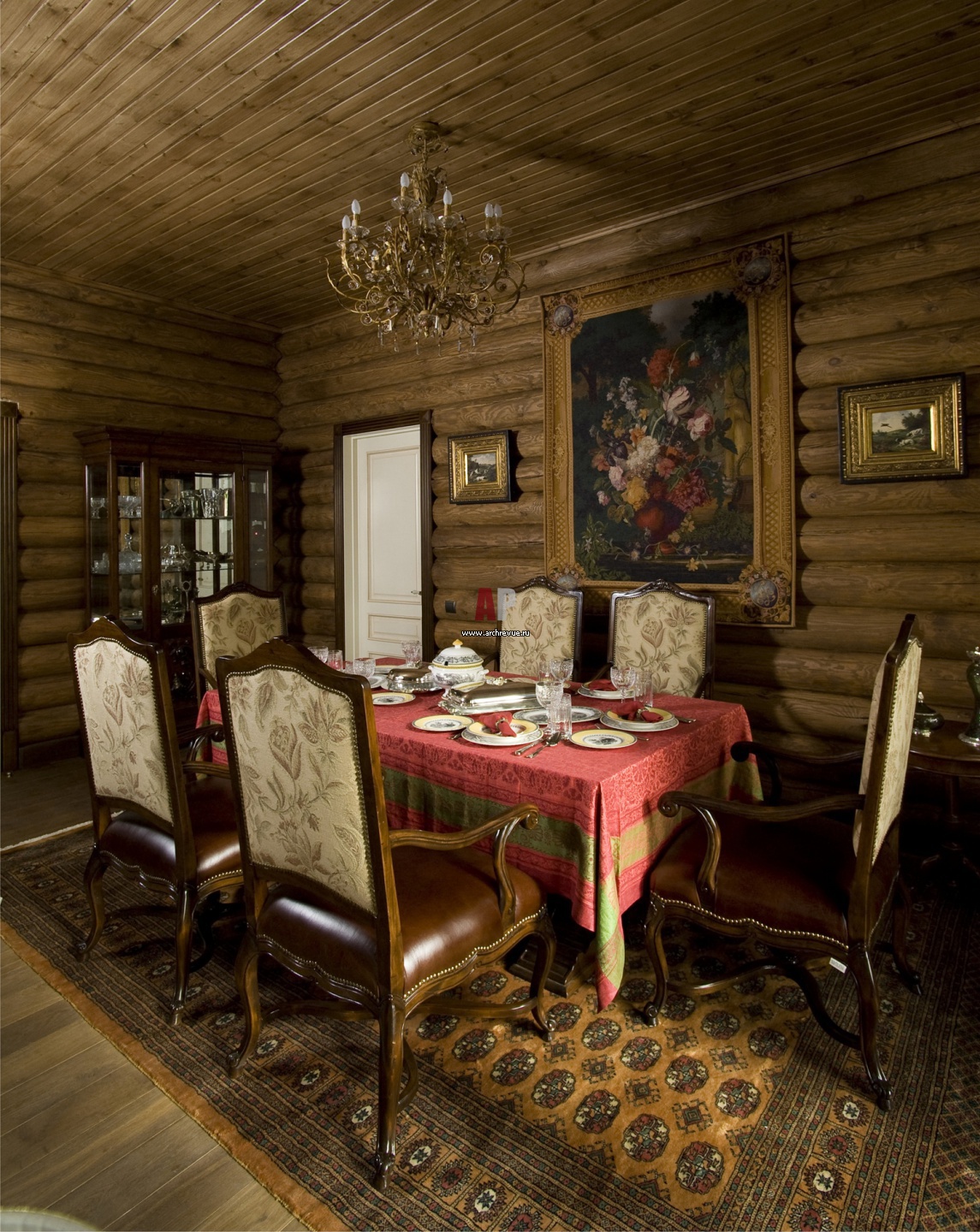 Фото интерьера столовой гостевого деревянного дома в неоклассическом стиле