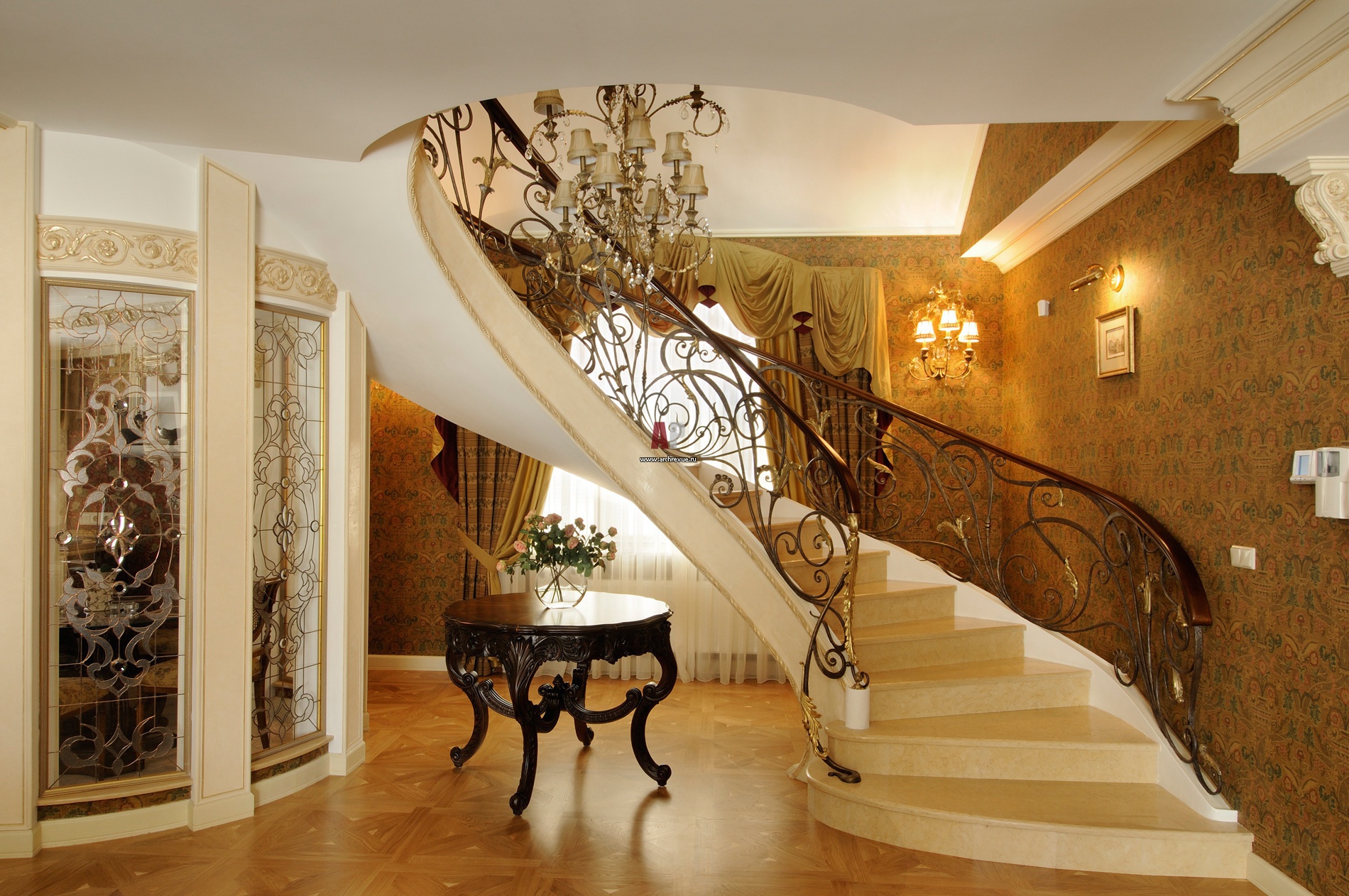 Чтобы увеличить площадь общественной зоны, архитектор перенесла парадную лестницу немного глубь и в сторону. На месте ее опоры она организовала полукруглое пространство в виде ротонды с витражами. В ротонде со стороны кухни получилось место для завтраков. Пластичная композиция выглядит живописно и настраивает на торжественный лад.