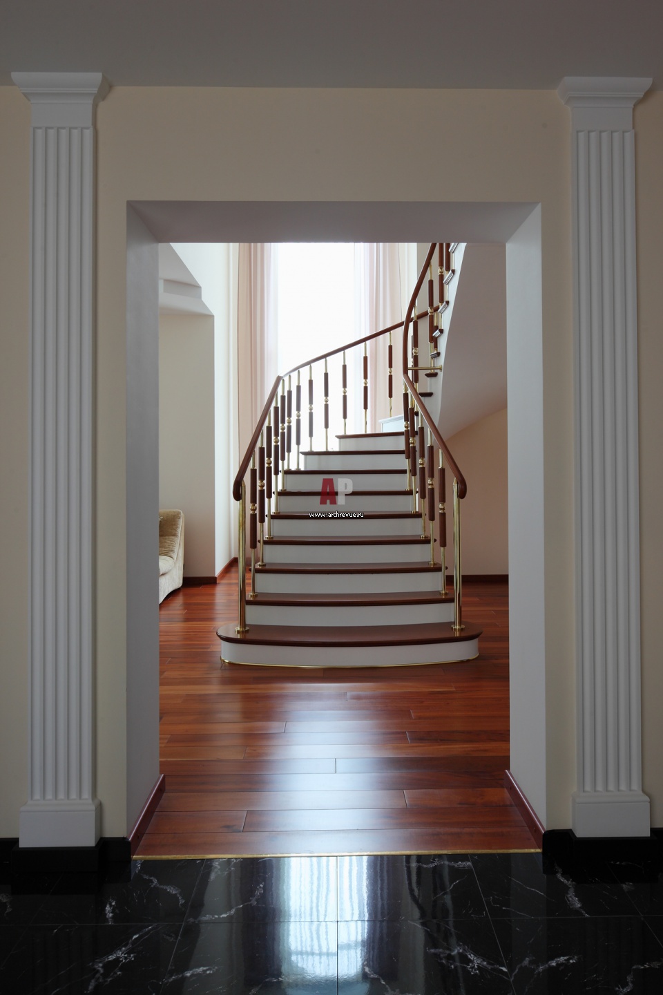 Лестница с металлическими золотистыми балясинами уводит на второй, приватный этаж дома с главной спальней и детскими комнатами.