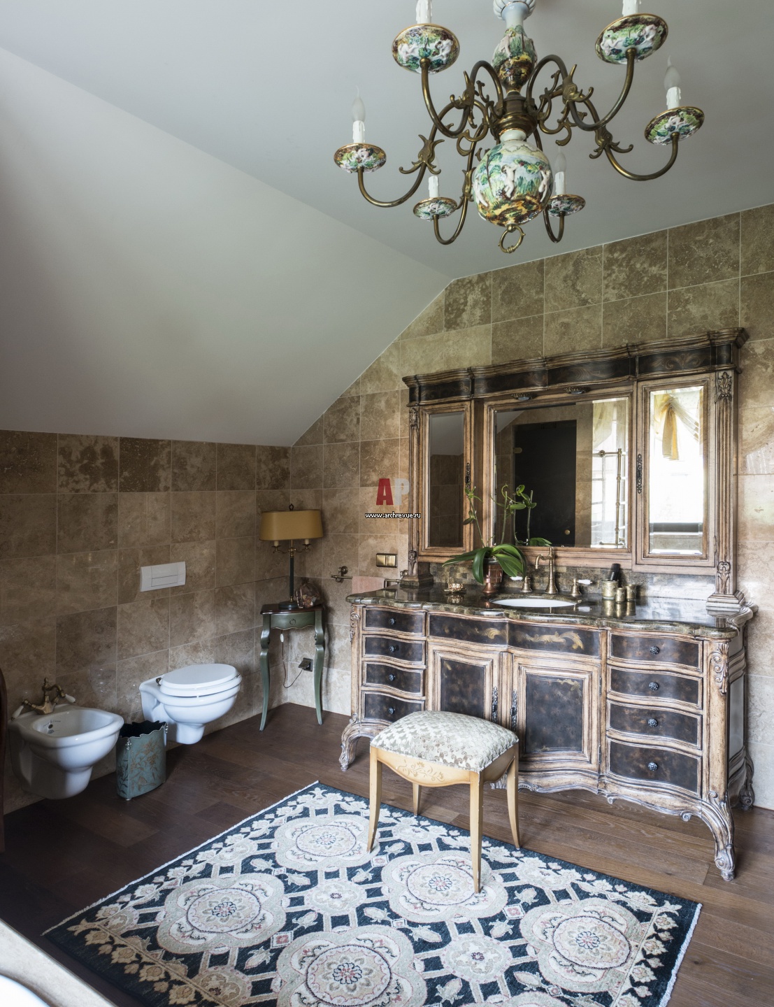 Интерьер хозяйской ванной комнаты исполнен в классическом стиле. Люстра с керамическими расписными ангелочками, антиквариат. Пол и стены облицованы травертином.