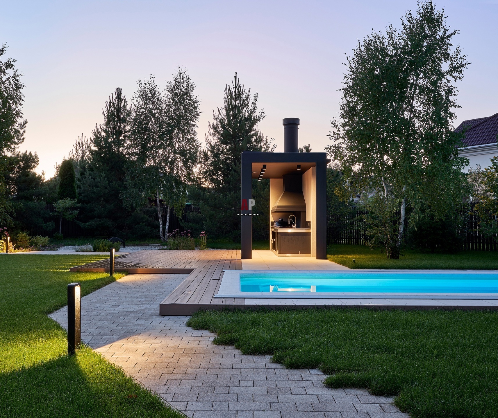 Современный дом для молодой семьи. Открытый бассейн на участке.