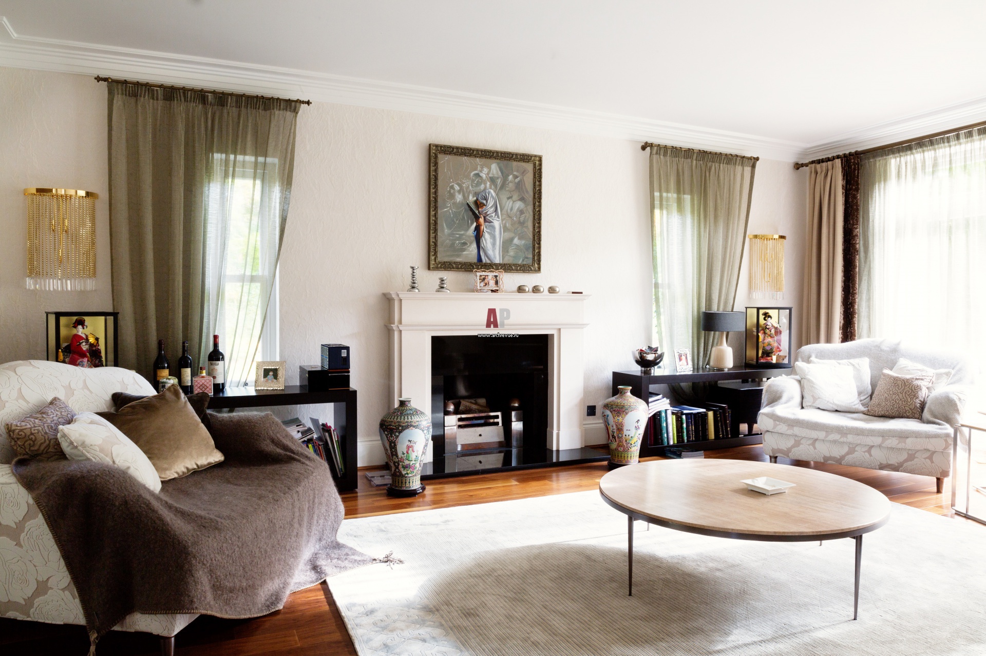 Непременный атрибут английской гостиной – камин. Портал камина сделан из светлого камня, пол вокруг облицован черным полированным мрамором.
