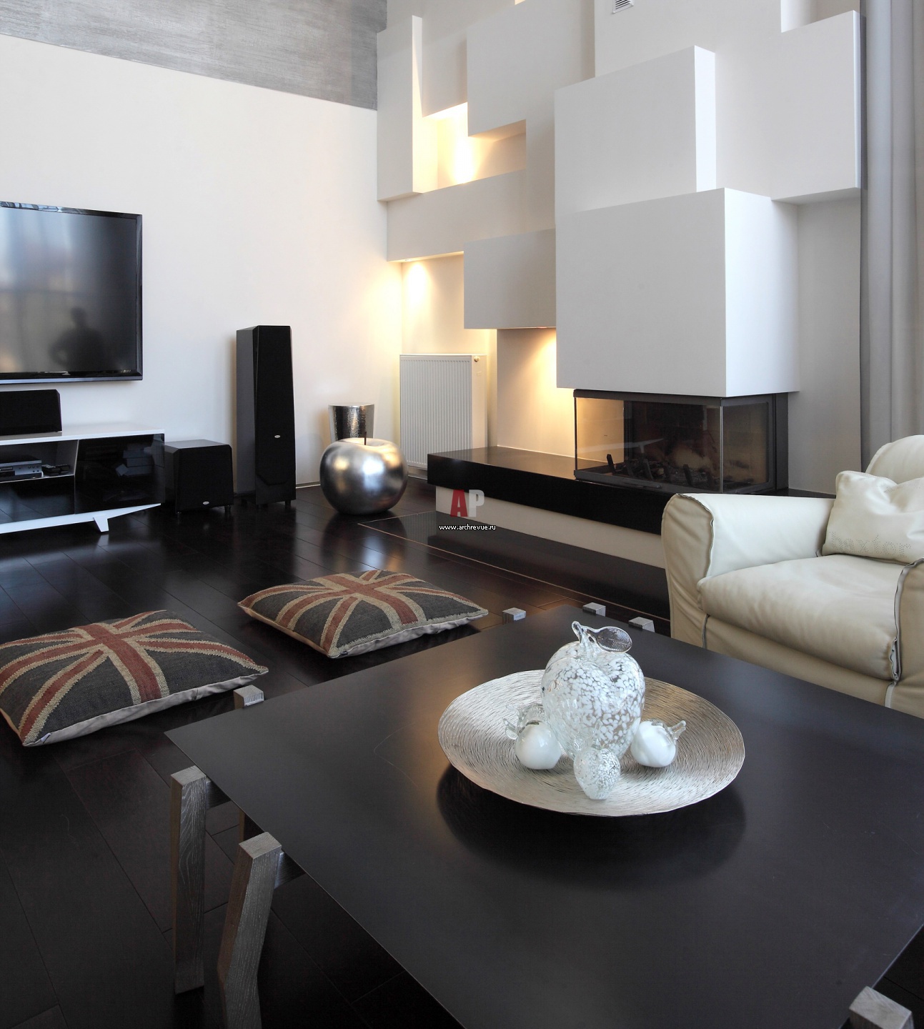 Украшение гостиной – декоративная структурная стена с камином. Топка и дымоход камина представляют собой скульптурный объем, набранный из разновеликих объемов с подсветкой.