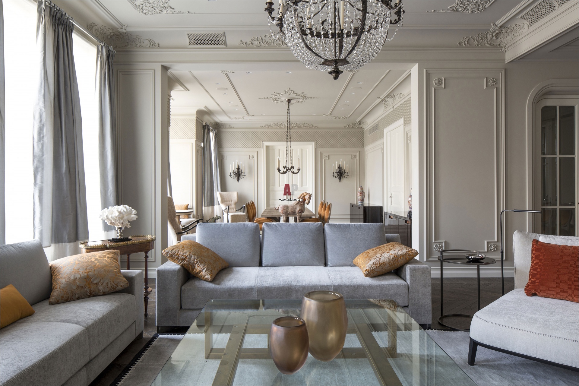 Парадная квартира в духе историзма начала ХХ века. Анфилада общей зоны: гостиной и столовой. Изысканный лепной декор, который был разработан индивидуально и выполнен классическим способом.