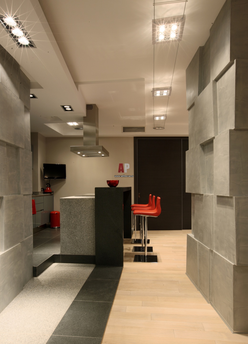 Фрагмент интерьера кухни в минимализме. Барная стойка сделана из гранита.