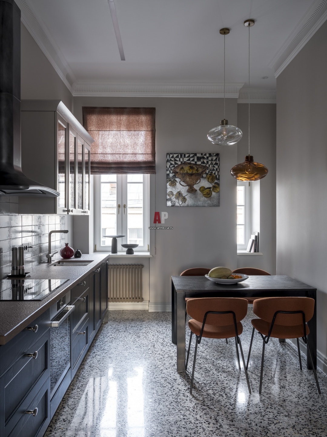 Кухня Hacker Kitchen выполнена в рустикальном стиле. Нижние шкафы темного-синего цвета, верхние – светлое дерево. Столешница выполнена из керамики с тактильной поверхностью. На полу – плитка-терраццо. Стол и стулья, Calligaris. Возле узкого окна в дореволюционные годы находилось помещение-холодильник для продуктов.