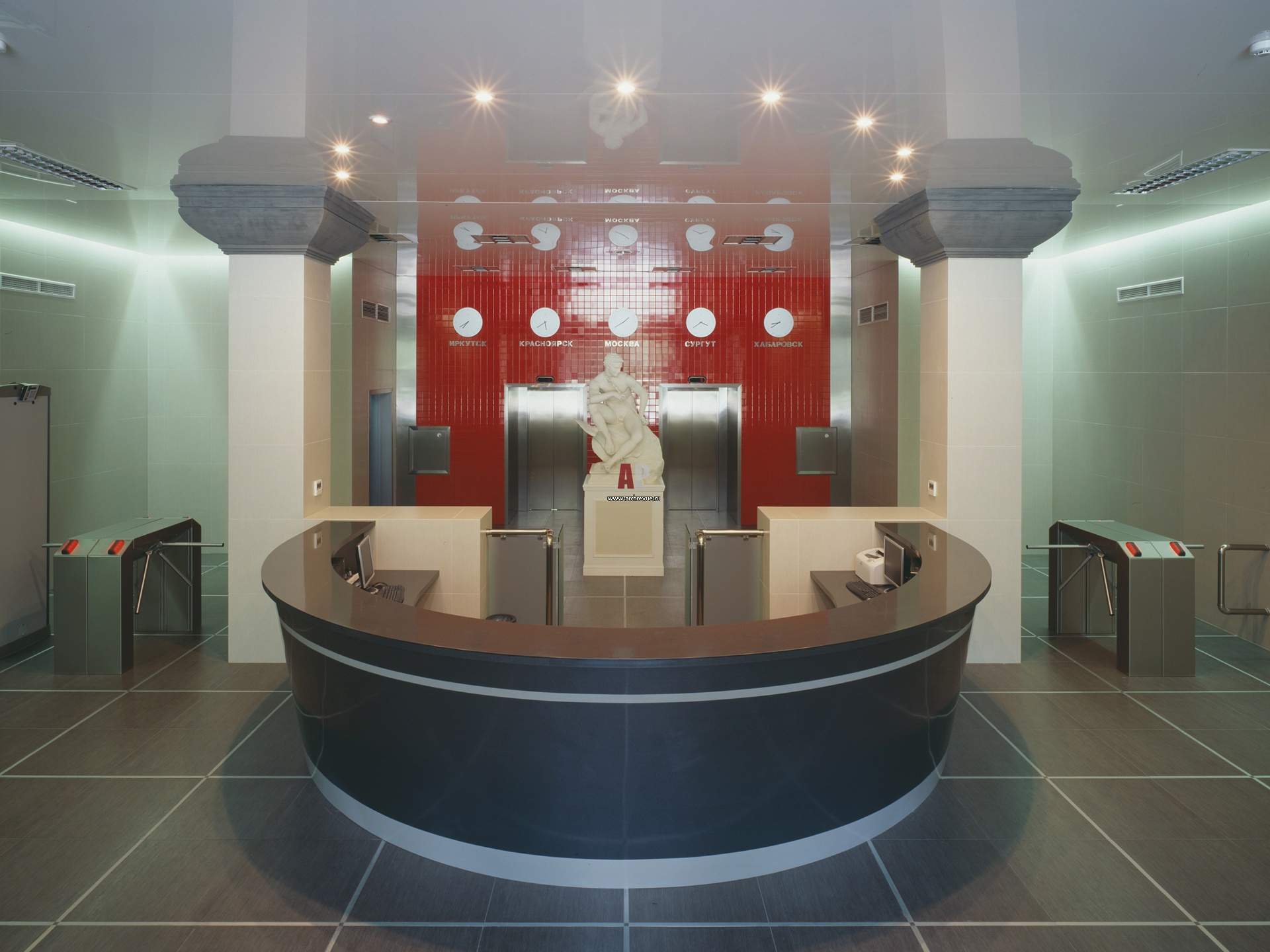 В минималистичном интерьере этой зоны центральное место занимает скульптура Гермеса современного автора, выполненная в классической традиции. За ней мозаичное панно красного цвета с часами, циферблаты которых показывают время в разных городах России. Изделия из дерева «Ю Мебель»