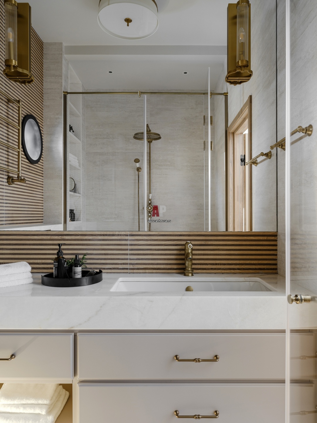 Санузел при гостевой спальне на втором этаже. Керамогранит, Porcelanosa. Столешница изготовлена из мрамора.