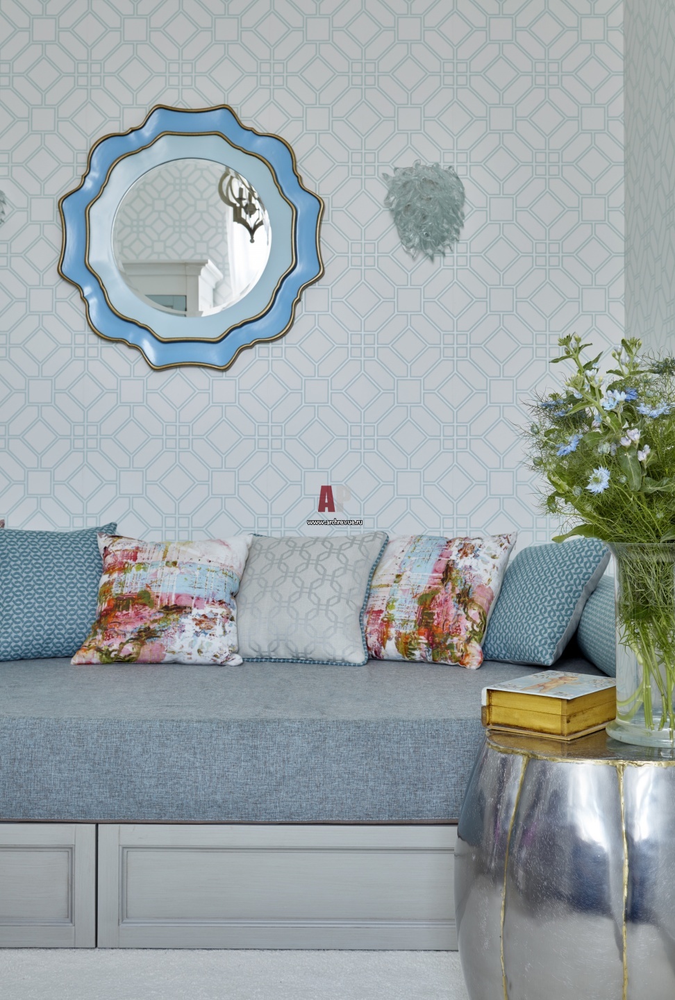 Детская спальня старшего сына выполнена в серо-бирюзовых тонах.