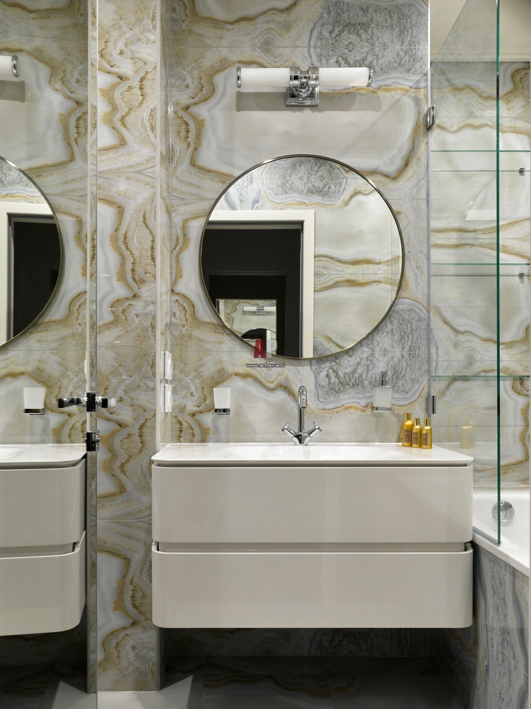 Стены хозяйской ванной комнаты облицованы керамогранитом с фактурой оникса, Aparici, серия Beyond Turquesa Pulido. Сантехника, Am.Pm.