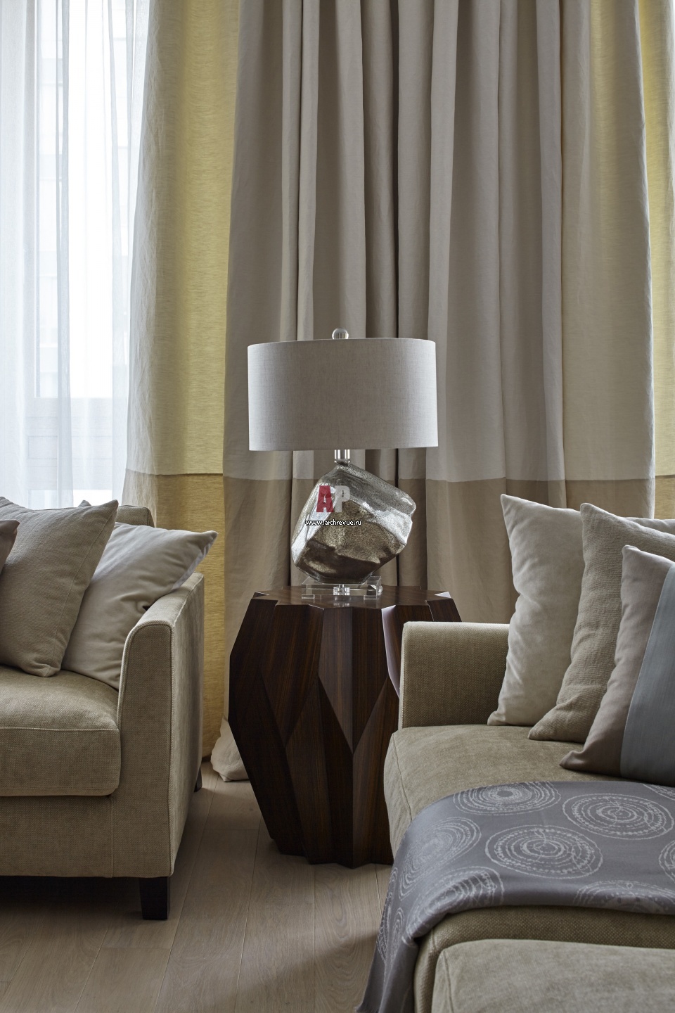 Несмотря на современную стилистику, интерьер квартиры выглядит теплым и уютным за счет мягкой цветовой гаммы и фактуры дерева. Столик, Global Views. Настольная лампа, Uttermost. Шторы сшиты изо льна.