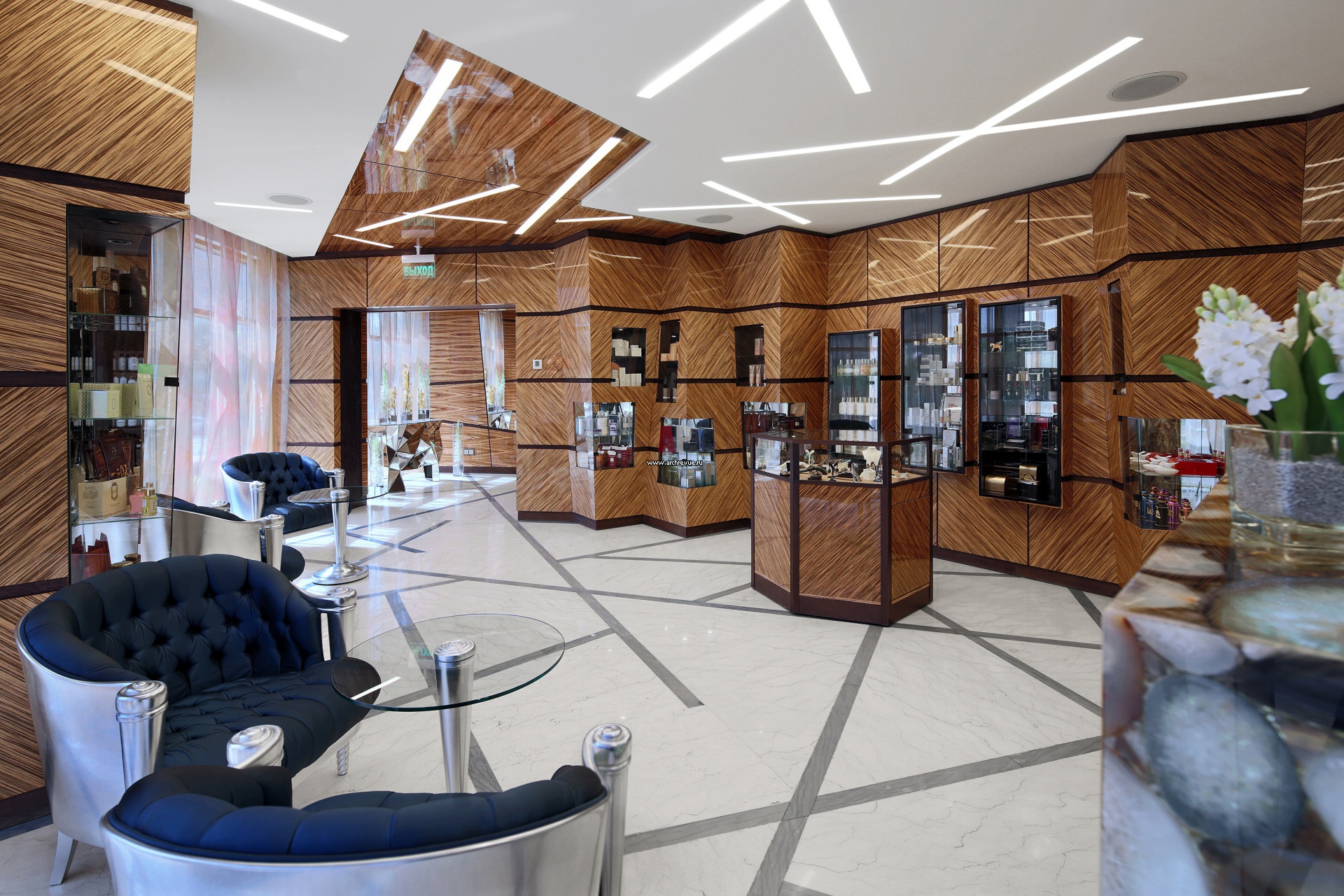 Сложную по геометрии композицию создают деревянные панели из шпона зебрано, оформленные руcтами из ореха. Переходящее со стен на потолок в хаотичном порядке панелированием придает интерьеру динамичность и графичность, масштабирует помещение.