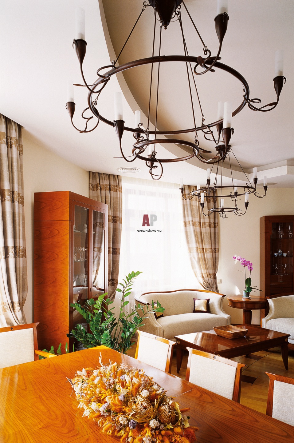 Вид со стороны обеденного стола на зону отдыха. Столовая группа и диванная зона акцентированы коваными дисками светильников в стиле ар-деко.