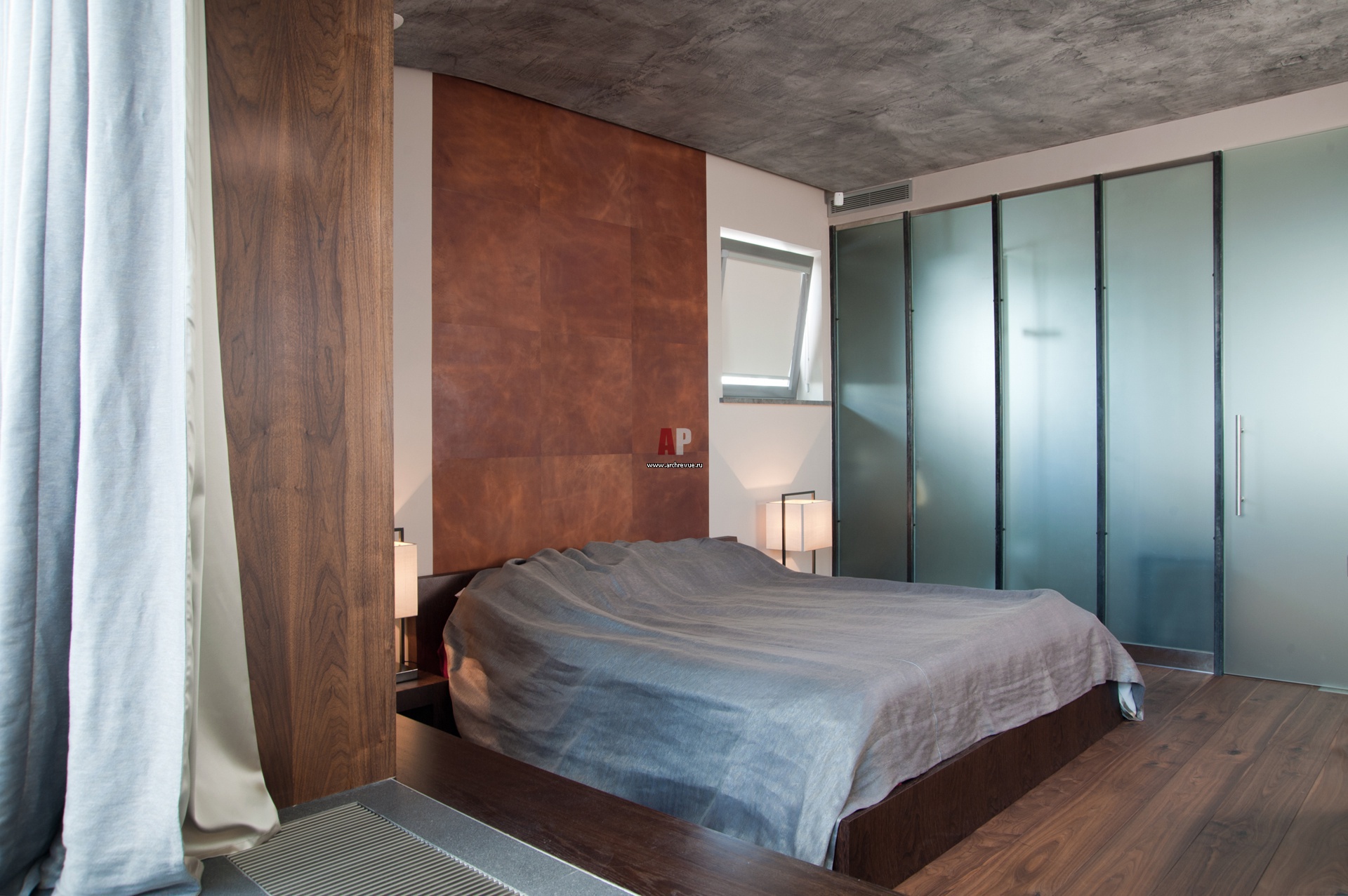 Фото современного интерьера спальни. Стена за изголовьем кровати зашита панелями из коричневой кожи, потолок оформлен отделкой под бетон, на полу – дубовая доска. За перегородкой из матового стекла – ванная комната. Перегородка набрана из четырех вертикальных фрагментов на металлическом каркасе, такой прием задает ритм. Внутрипольные конвекторы, Moehlenhoff.