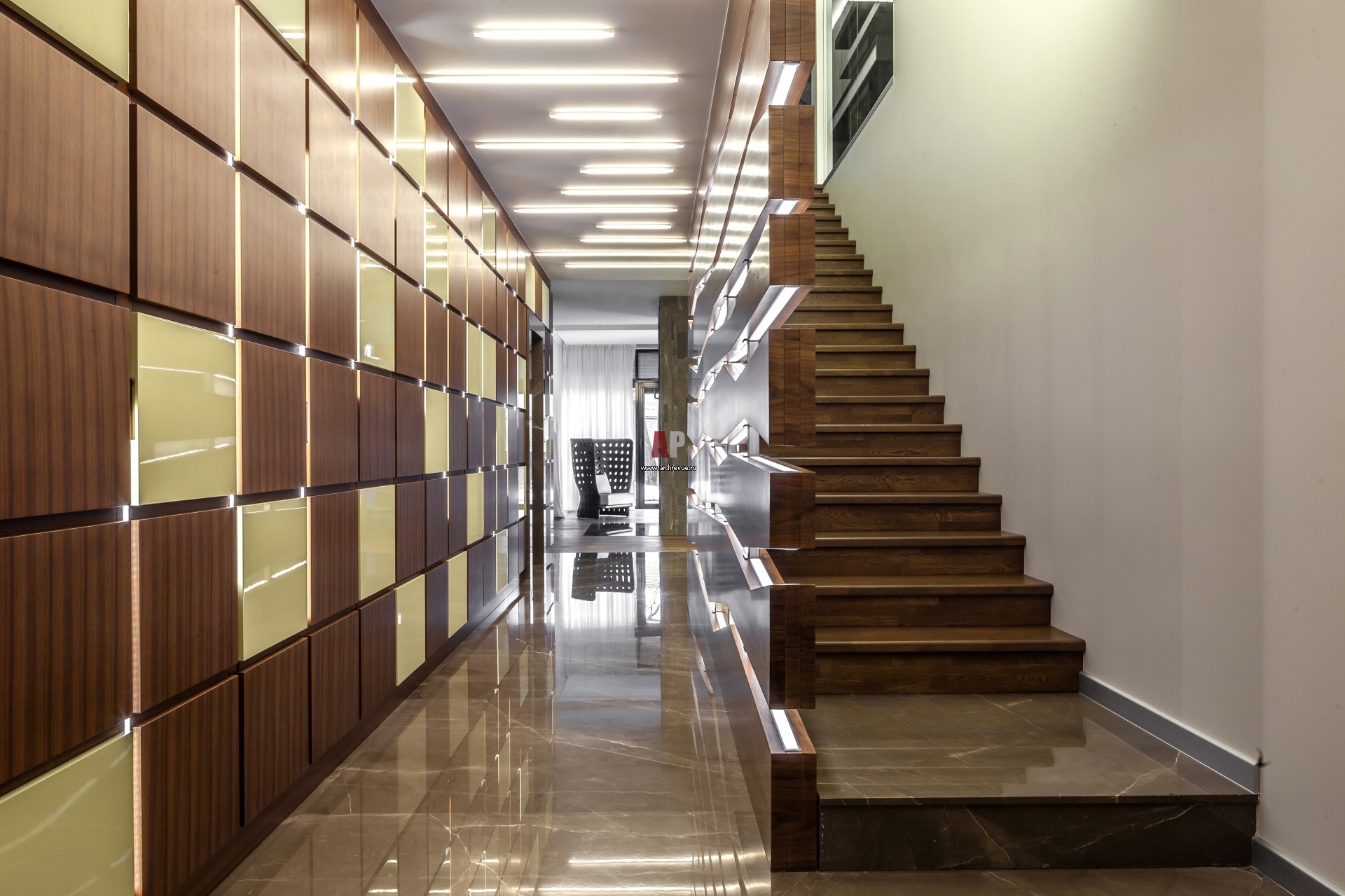 Лестничный холл цокольного этажа. Деревянная перегородка с шахматным рисунком из двух видов дерева, изготовление «АФ Ника».
