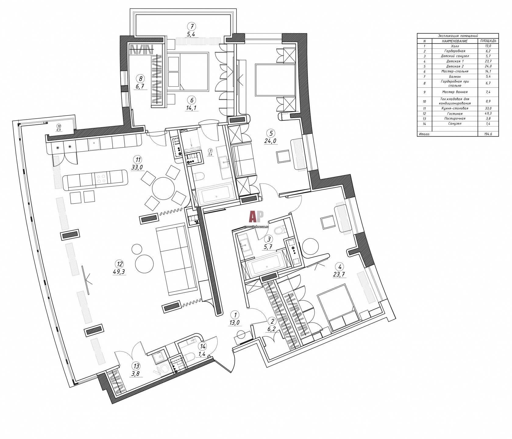 Перепланировка 4-х комнатной квартиры в новом ЖК, 220 кв. м.