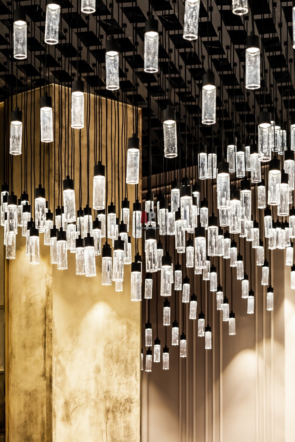 Лобби отеля Mercure Hotel Kaliningrad. Потолок над баром оформлен современными лаконичными светильниками, подвесы разного размера создают эффект волны.