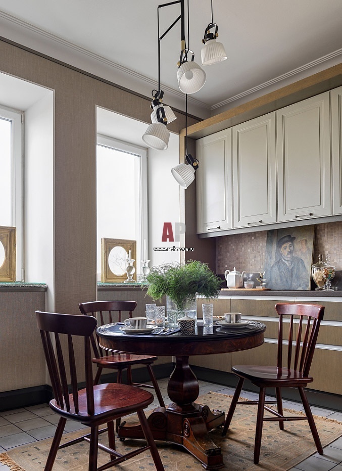 Интерьер кухни. Подоконники тераццо – исторические. Обеденный стол с каменной столешницей, Франция, начало XIX века. Кухонная мебель сделана на заказ. Картина, Голландия, начало XX века. На полу – индийский килим.